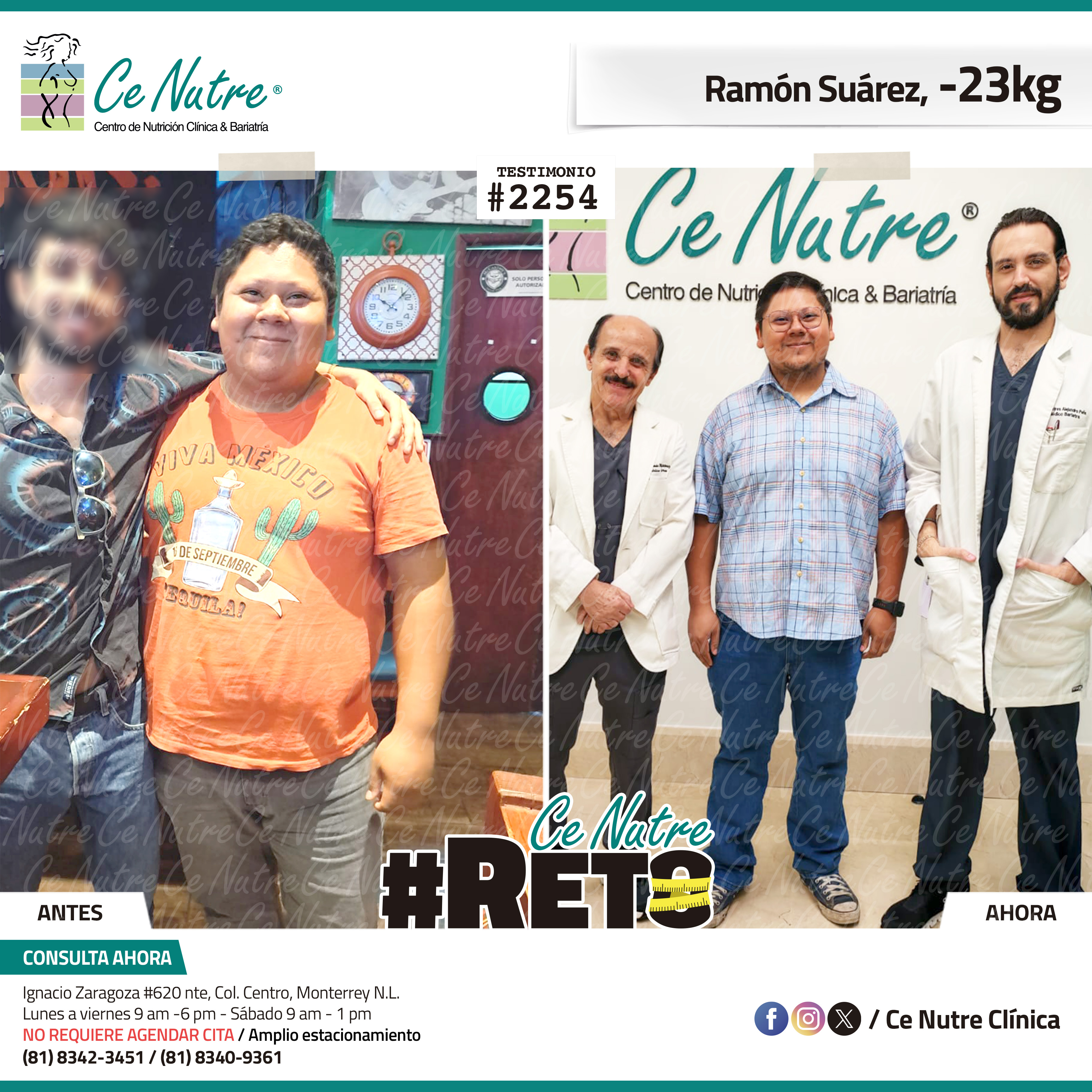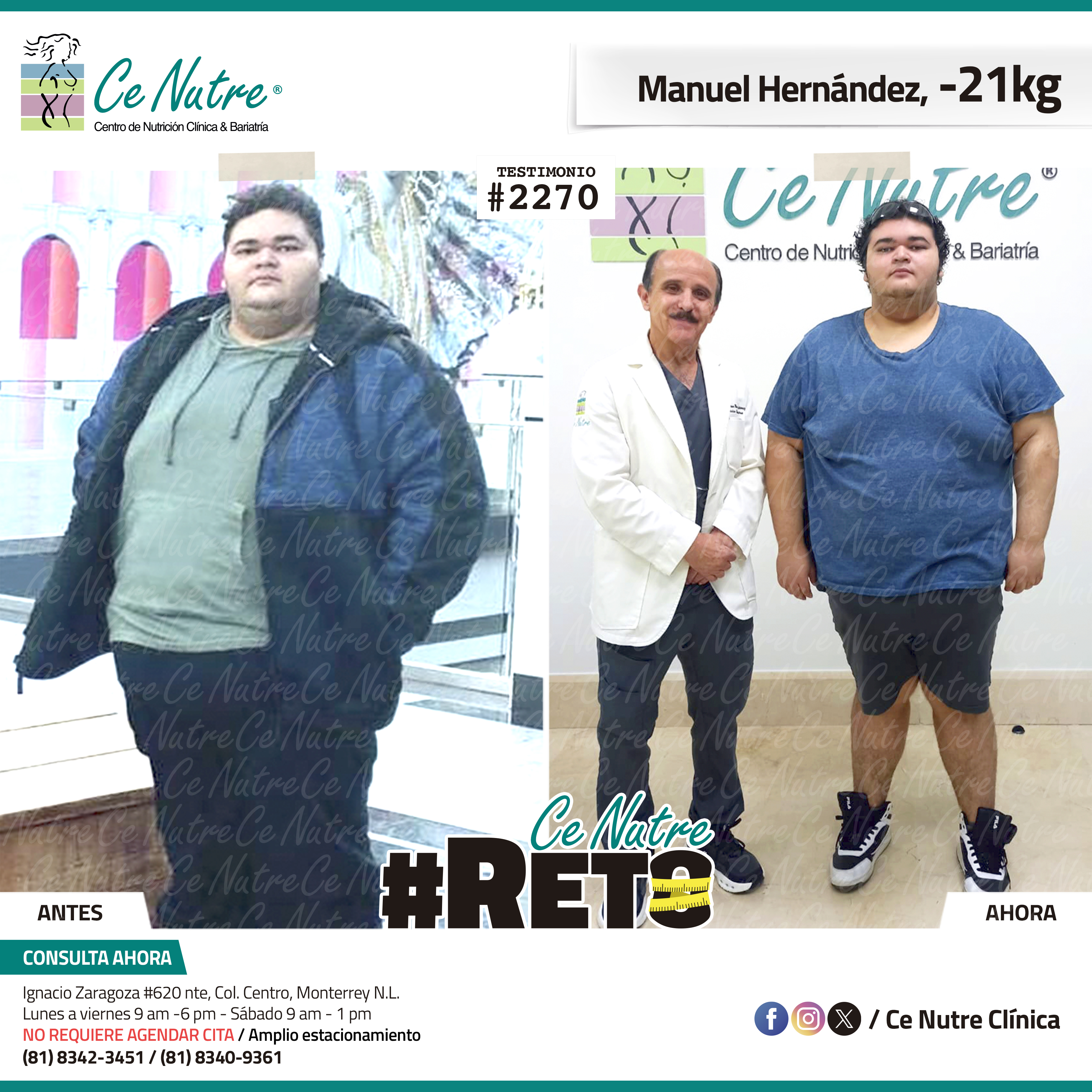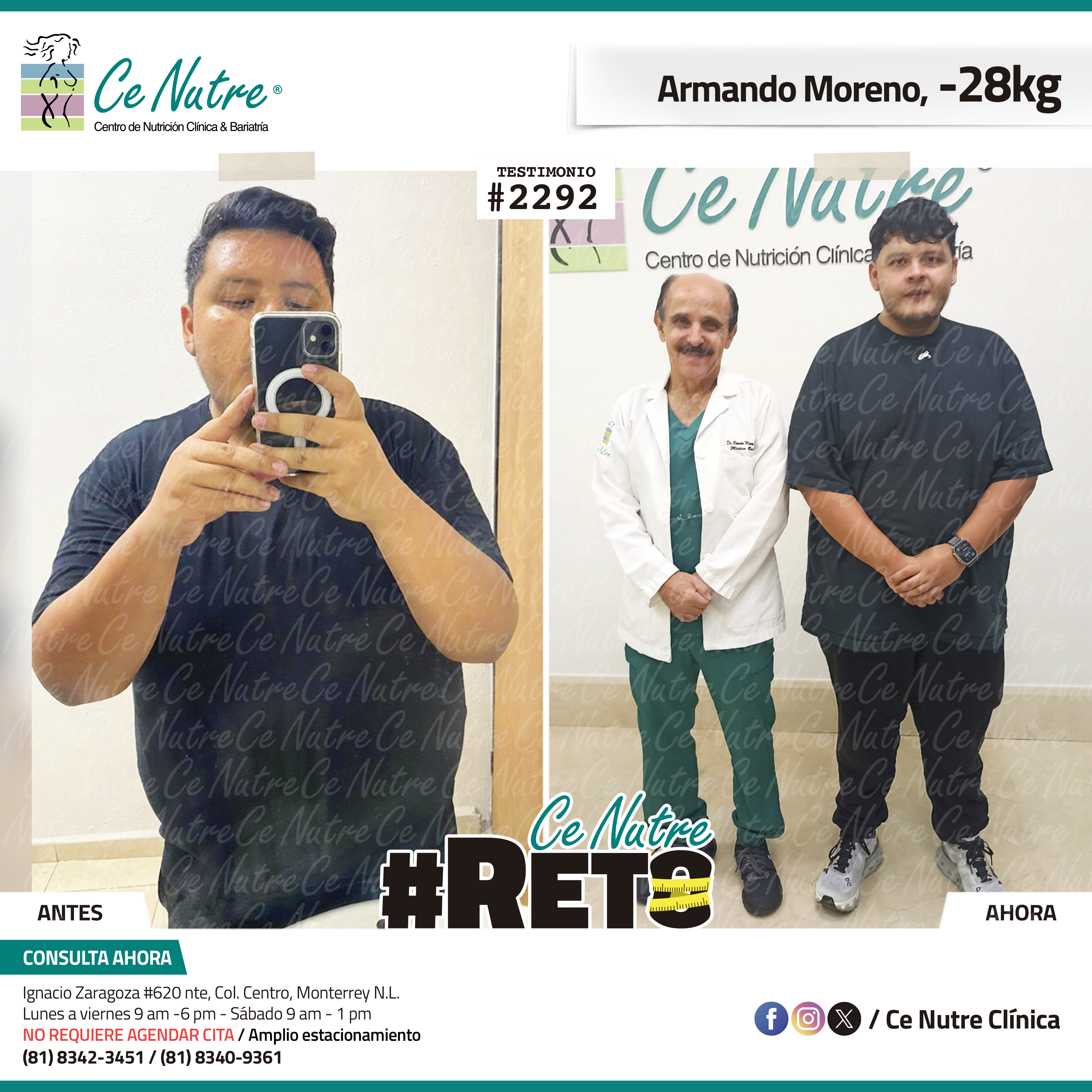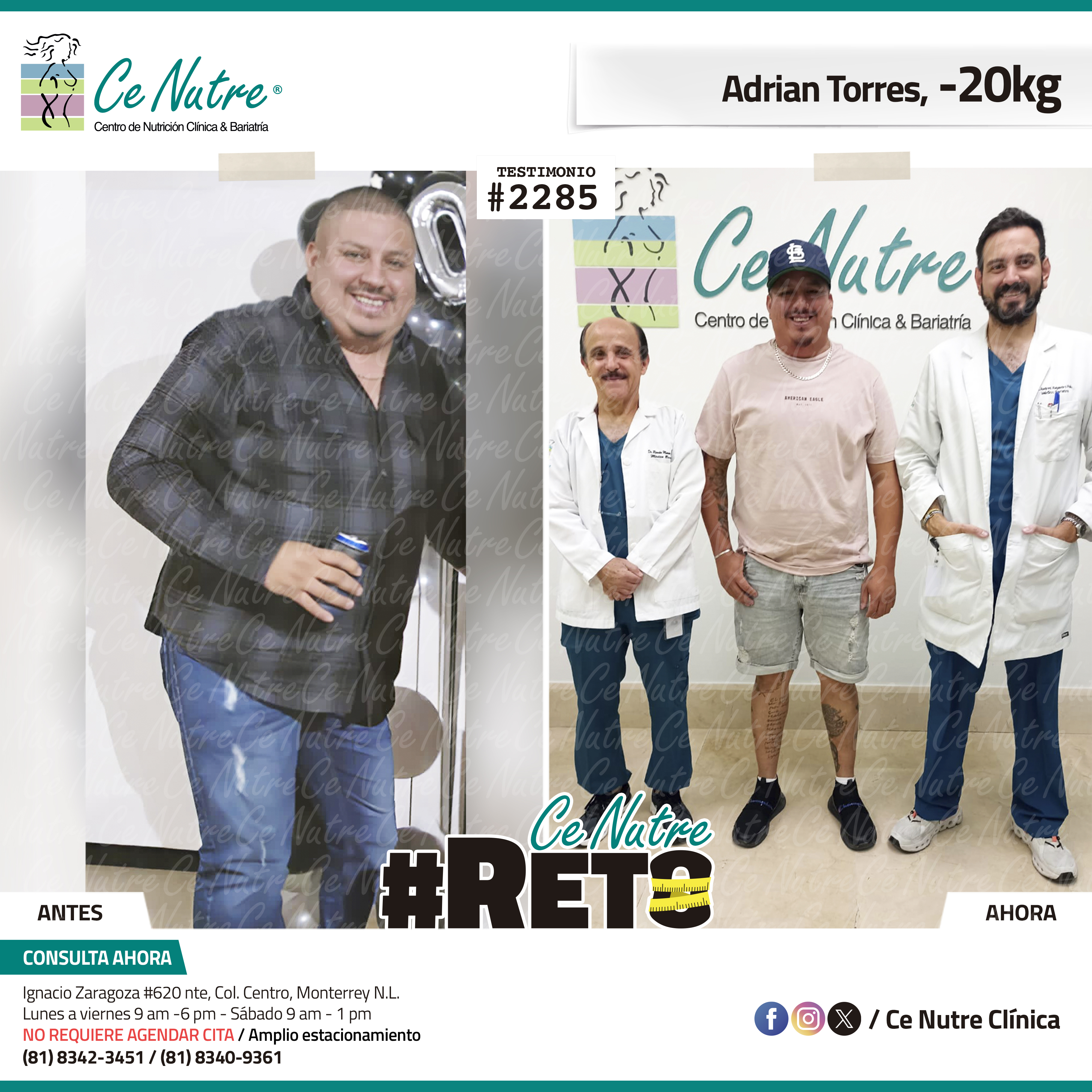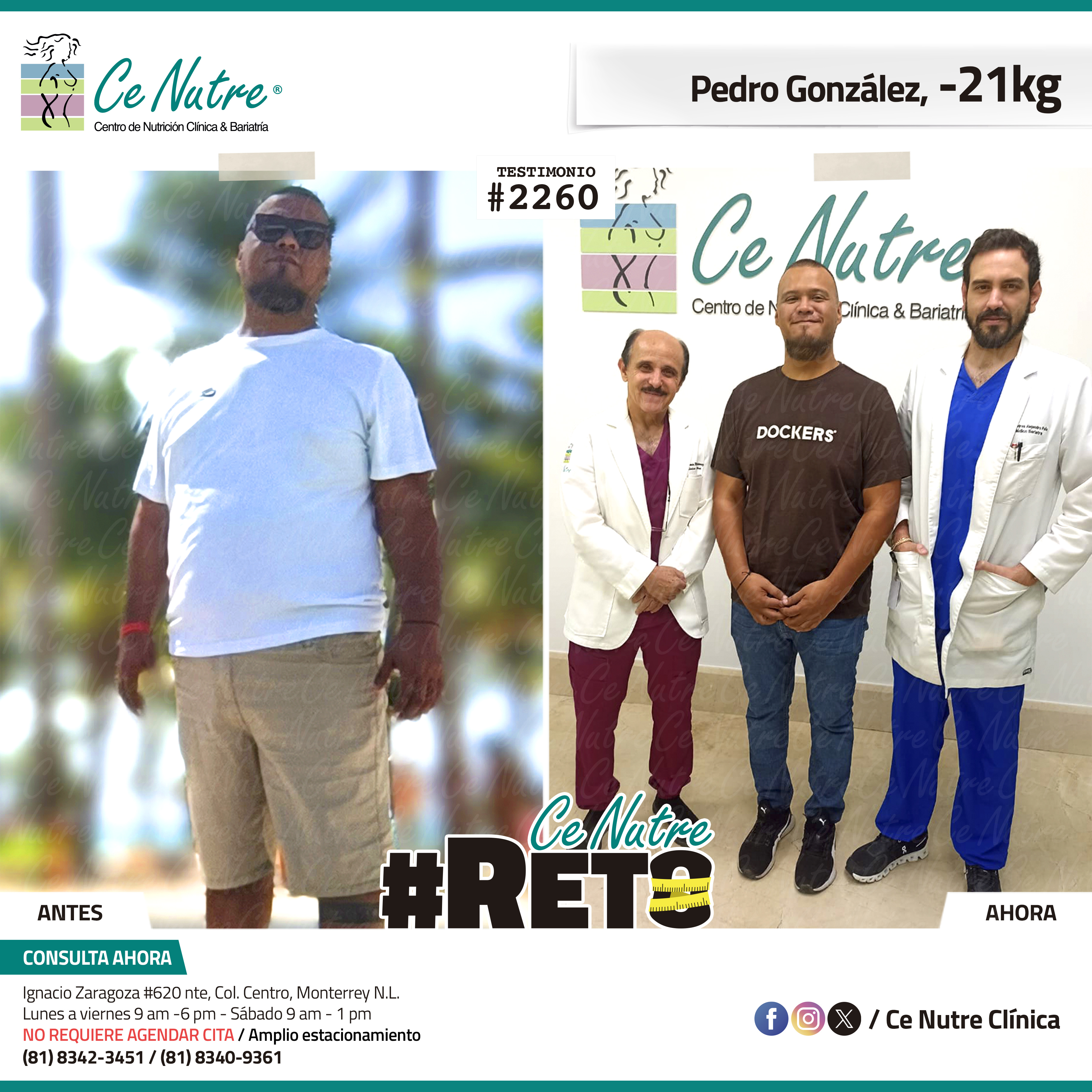 “Hola mi nombre es Adrian Torres y llegué a Ce Nutre por recomendación de mi pareja, tomé la decisión de venir ya que al realizar ciertas actividades en mi trabajo empecé a tener dificultades, estoy feliz de poder compartirles que me siento muy bien con la pérdida de peso que he logrado, no solo se trata de los números en la báscula, sino de la energía y la confianza que he recuperado. Cada día me siento más fuerte, más saludable y más cómodo conmigo mismo. Esto ha sido un desafío pero con mucha disciplina y siguiendo las indicaciones de los nutriólogos he obtenido muy buenos resultados, se los recomiendo.”