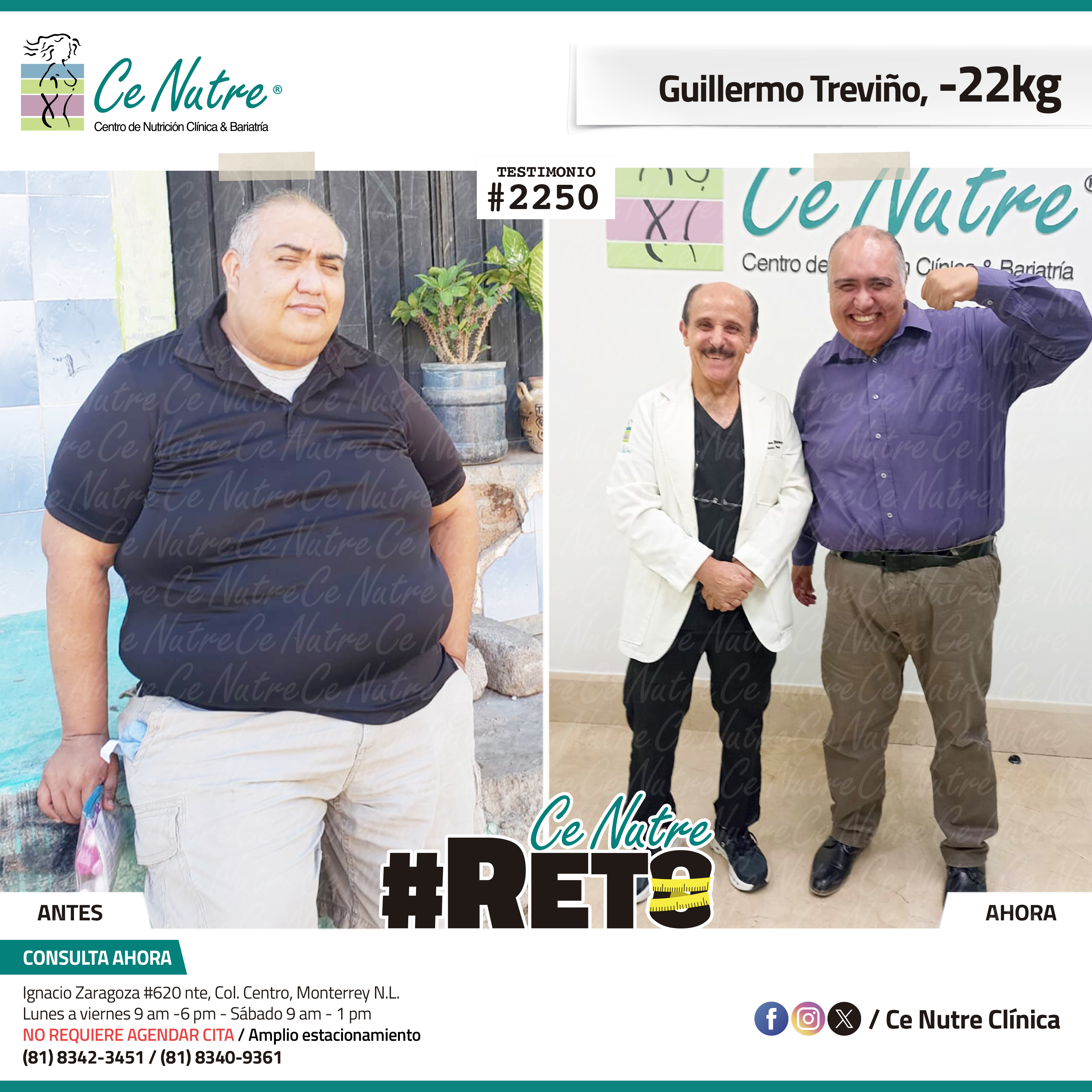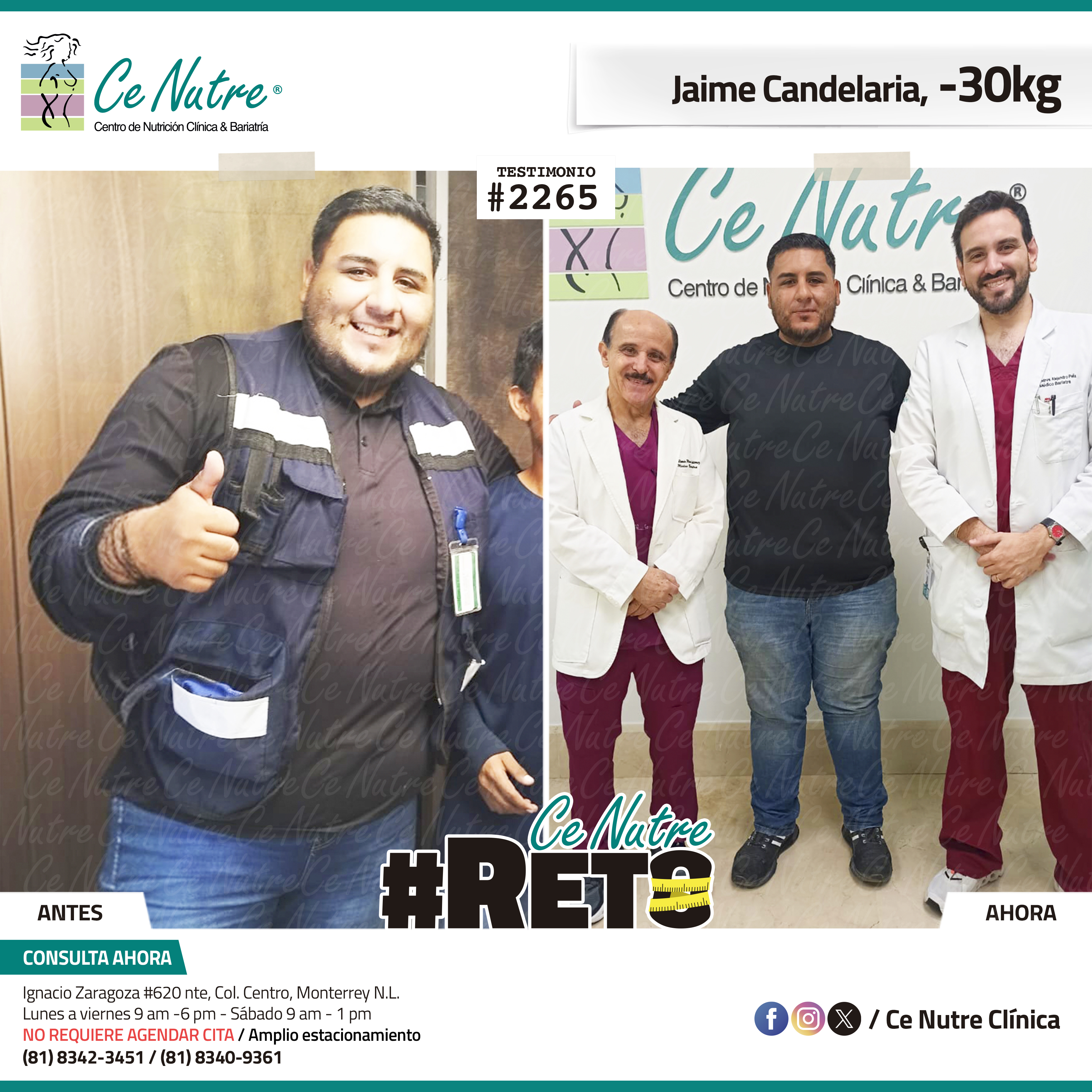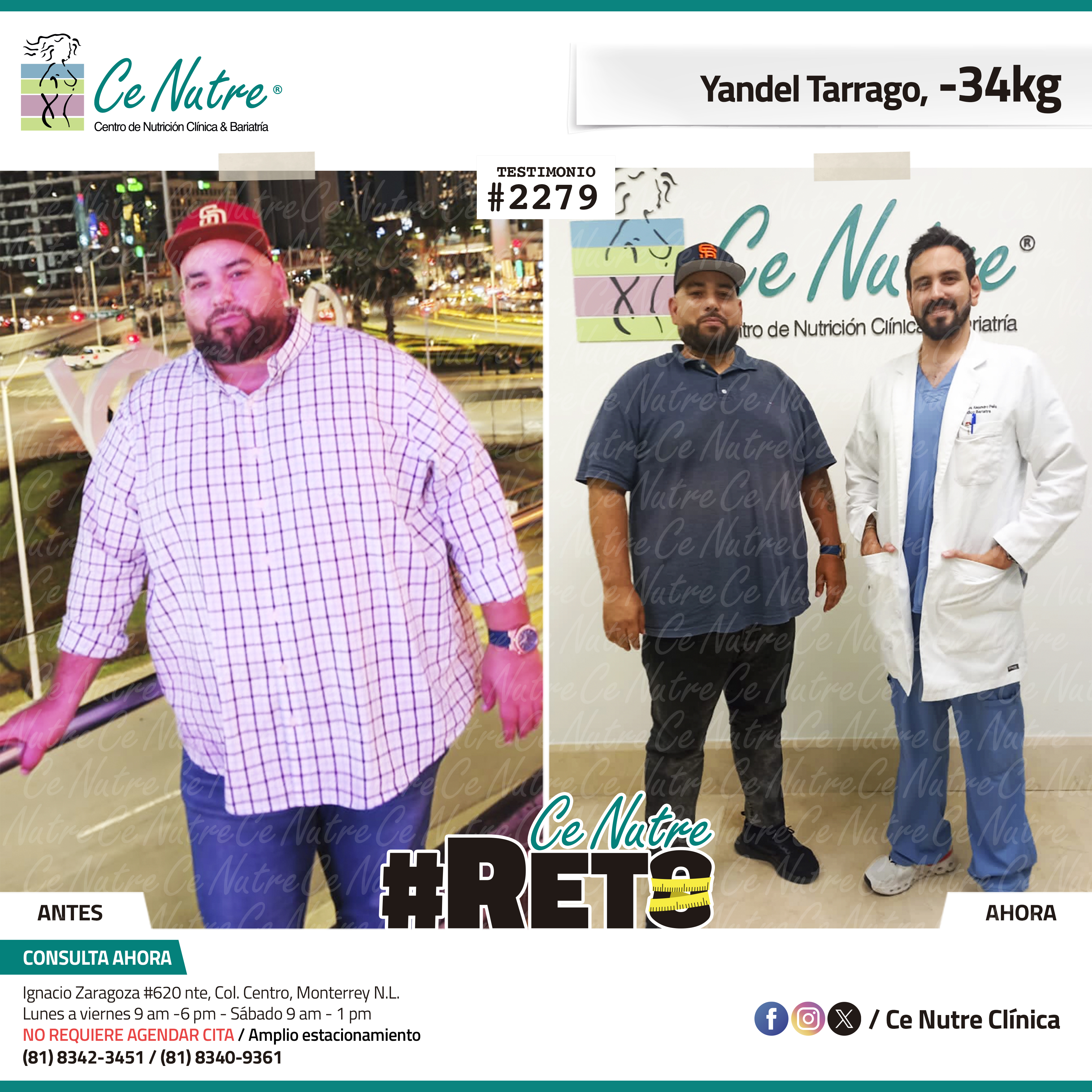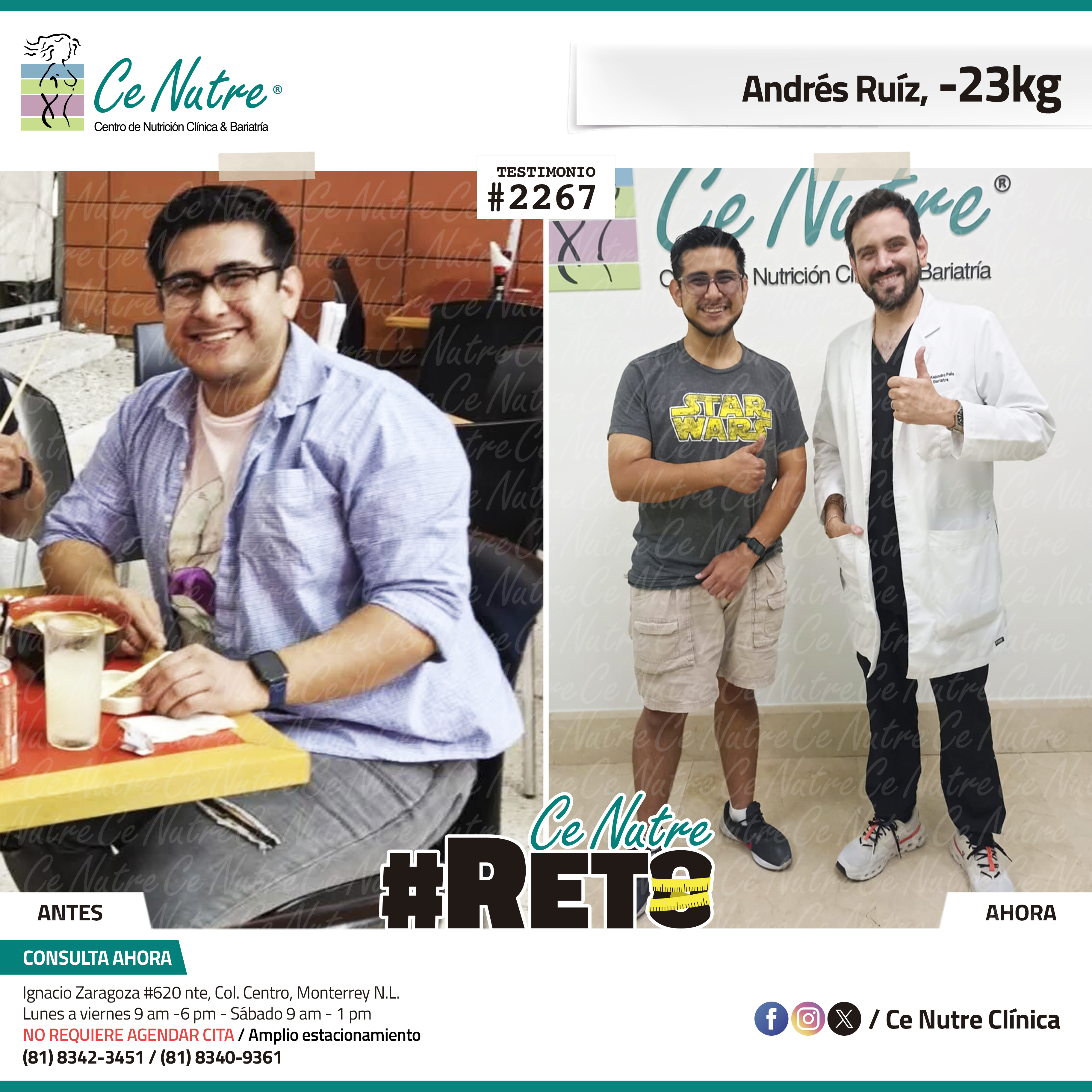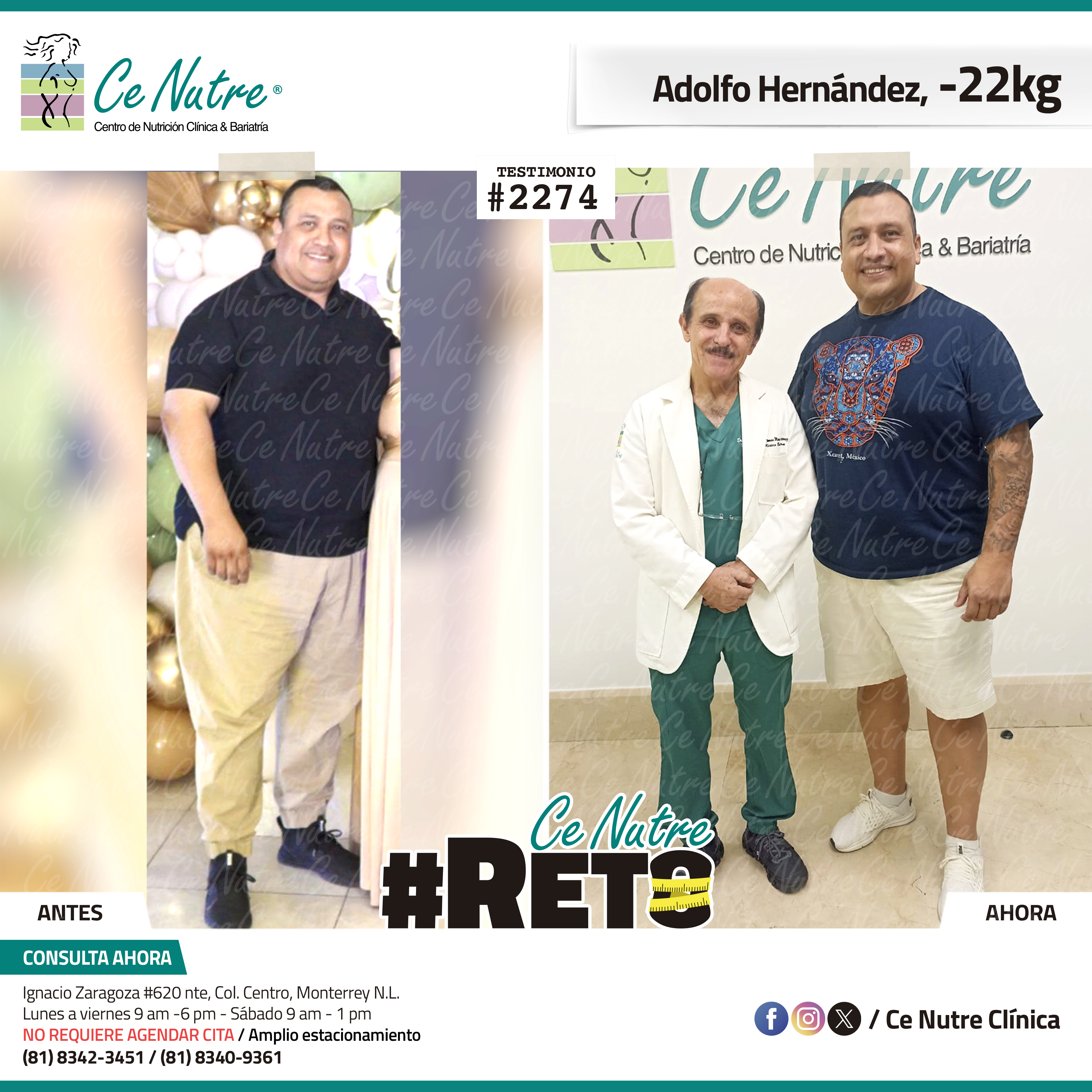 “Hola mi nombre es Adrian Torres y llegué a Ce Nutre por recomendación de mi pareja, tomé la decisión de venir ya que al realizar ciertas actividades en mi trabajo empecé a tener dificultades, estoy feliz de poder compartirles que me siento muy bien con la pérdida de peso que he logrado, no solo se trata de los números en la báscula, sino de la energía y la confianza que he recuperado. Cada día me siento más fuerte, más saludable y más cómodo conmigo mismo. Esto ha sido un desafío pero con mucha disciplina y siguiendo las indicaciones de los nutriólogos he obtenido muy buenos resultados, se los recomiendo.”
