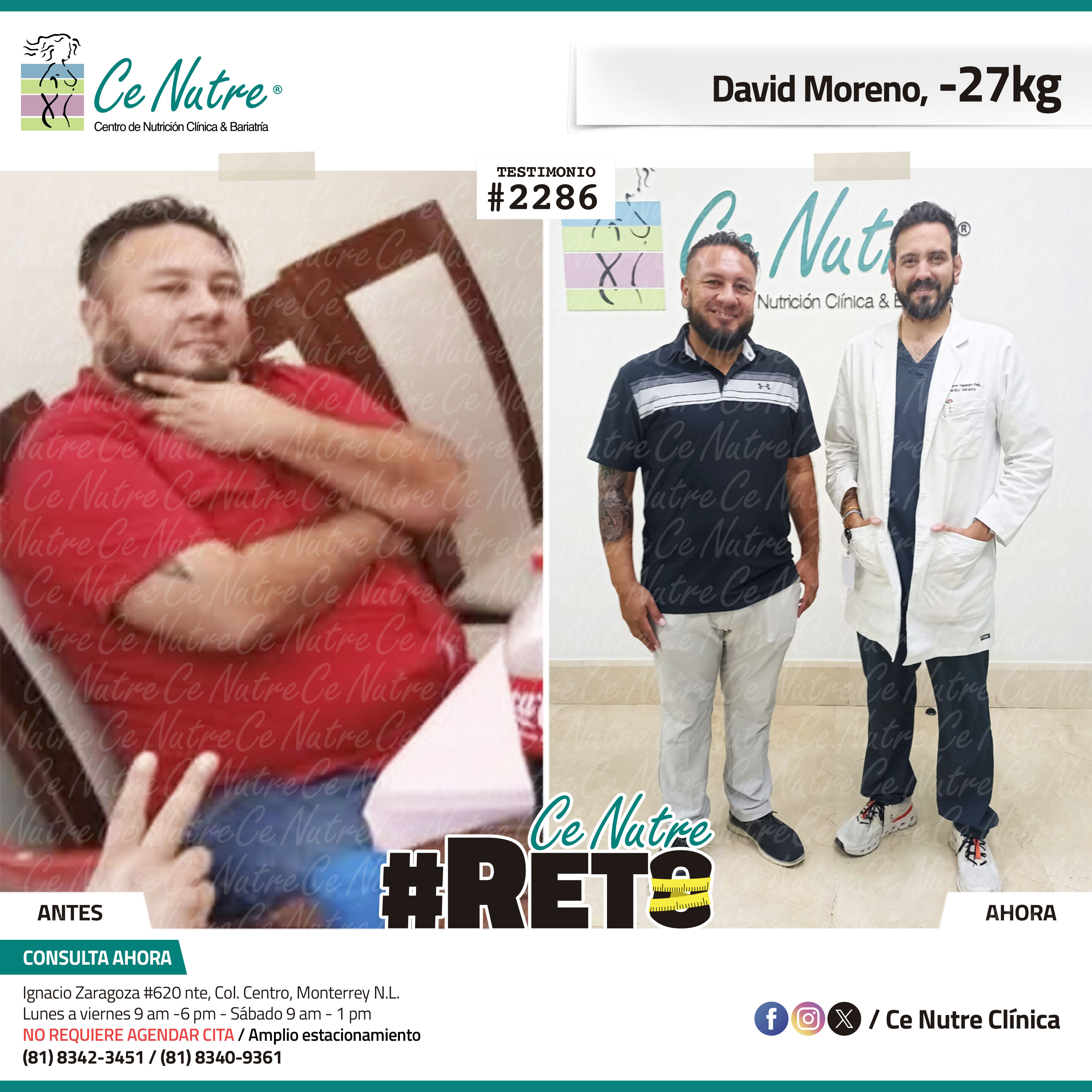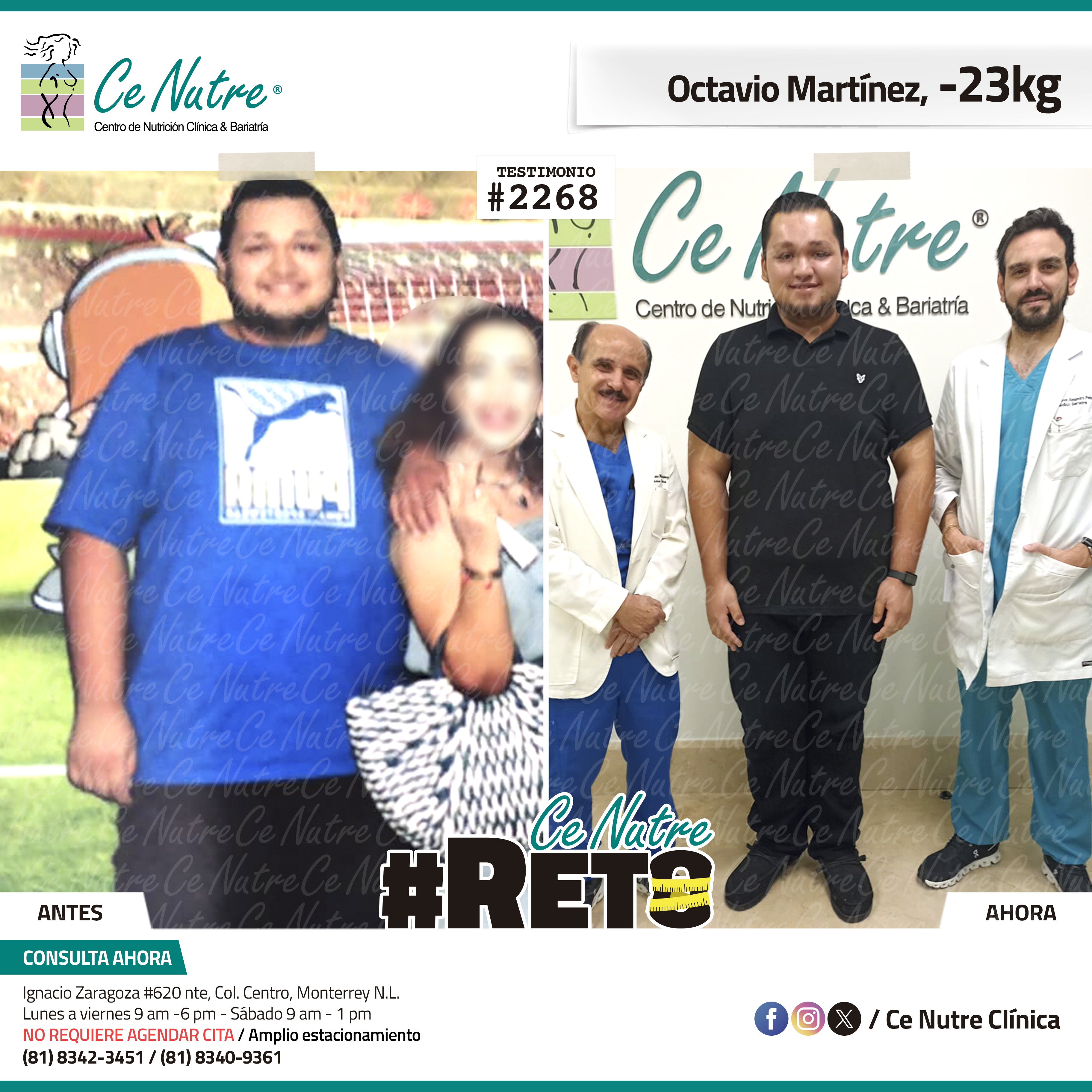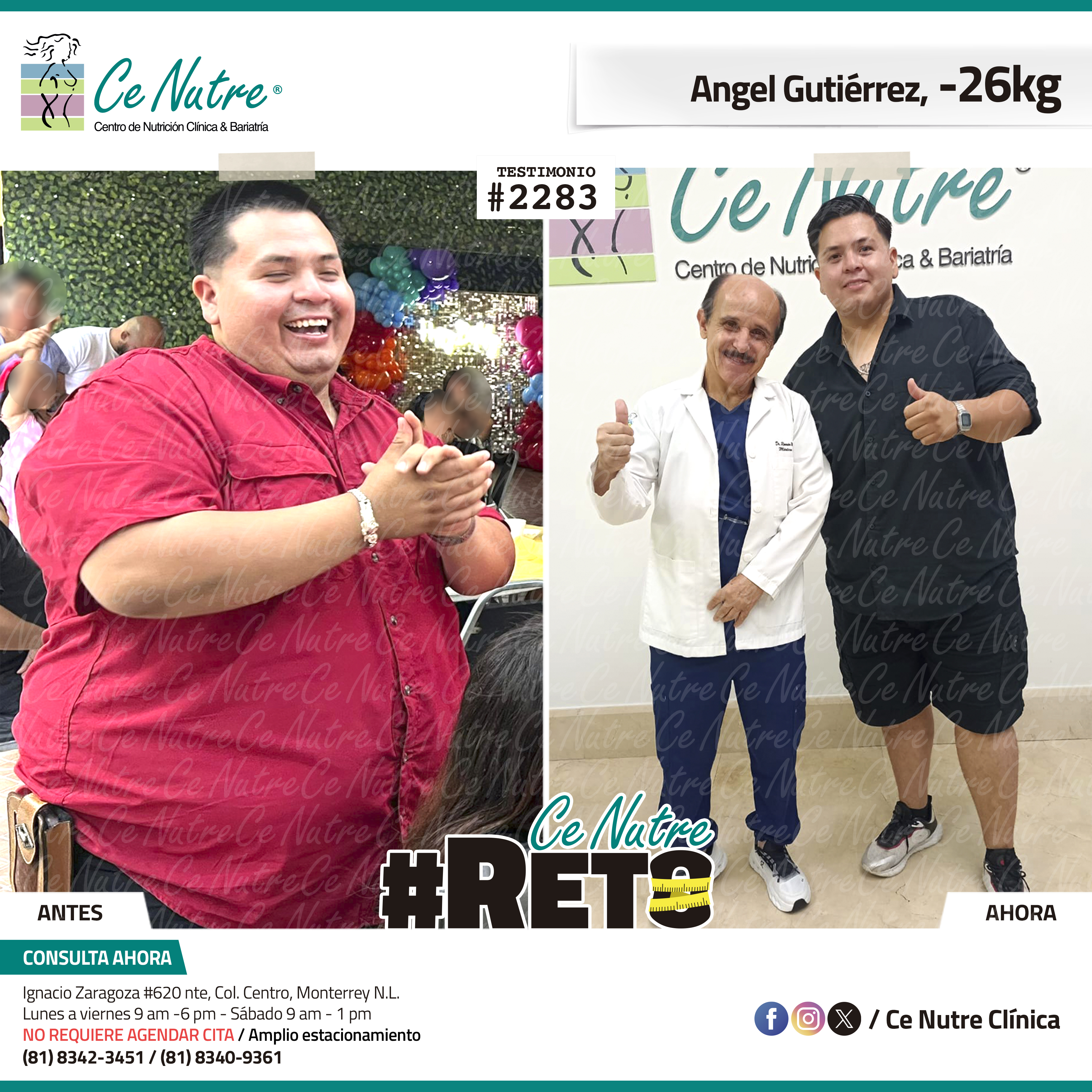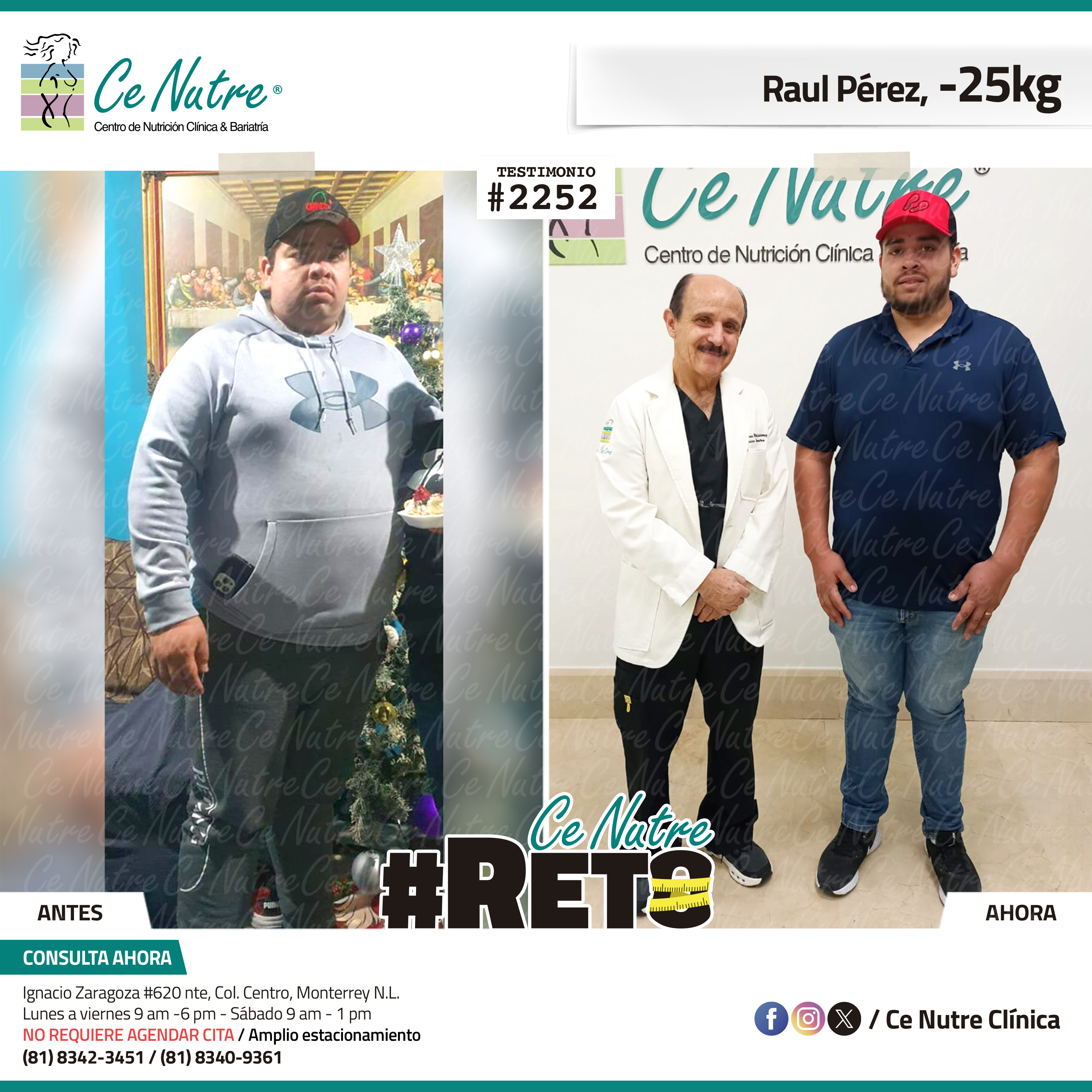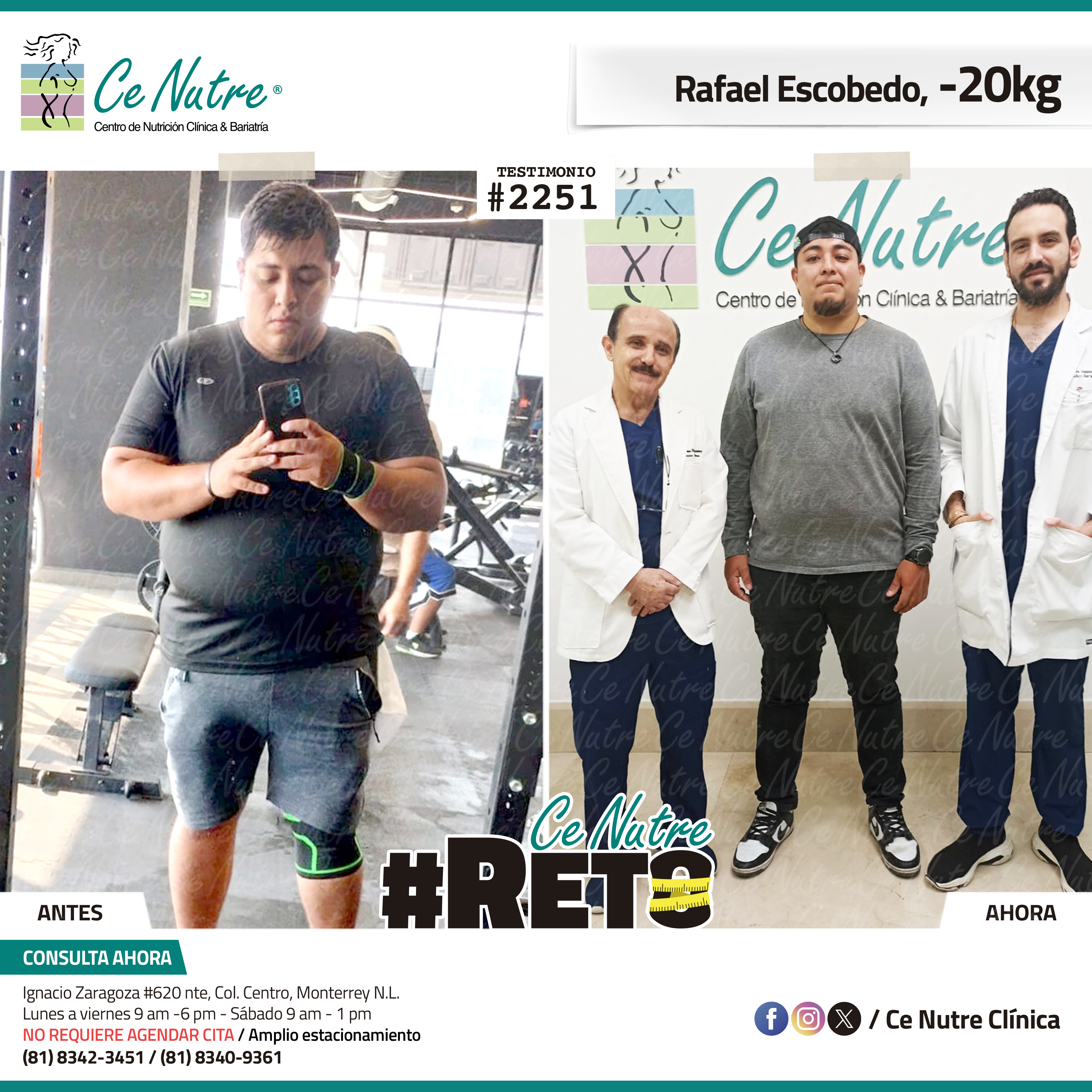 “Hola mi nombre es Adrian Torres y llegué a Ce Nutre por recomendación de mi pareja, tomé la decisión de venir ya que al realizar ciertas actividades en mi trabajo empecé a tener dificultades, estoy feliz de poder compartirles que me siento muy bien con la pérdida de peso que he logrado, no solo se trata de los números en la báscula, sino de la energía y la confianza que he recuperado. Cada día me siento más fuerte, más saludable y más cómodo conmigo mismo. Esto ha sido un desafío pero con mucha disciplina y siguiendo las indicaciones de los nutriólogos he obtenido muy buenos resultados, se los recomiendo.”
