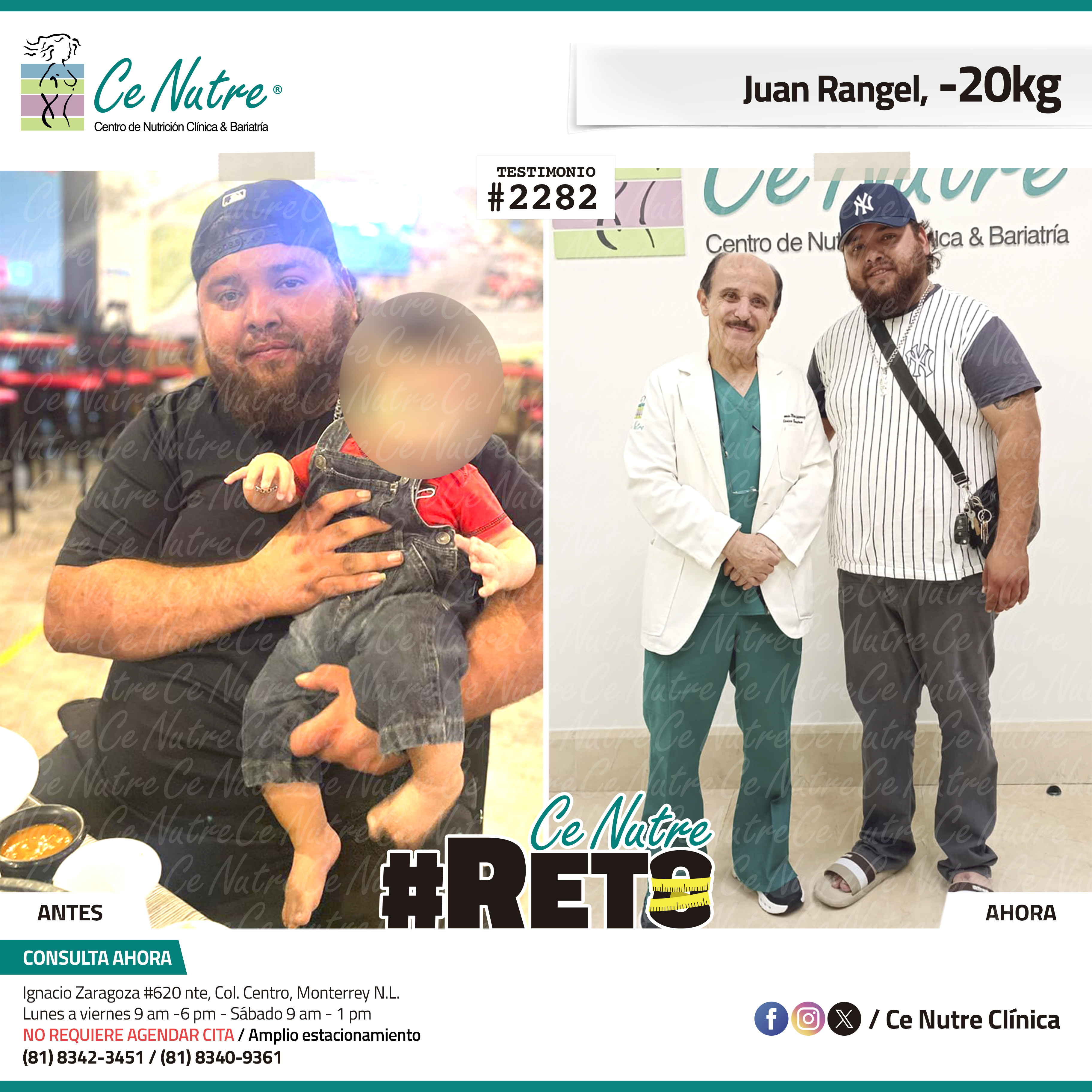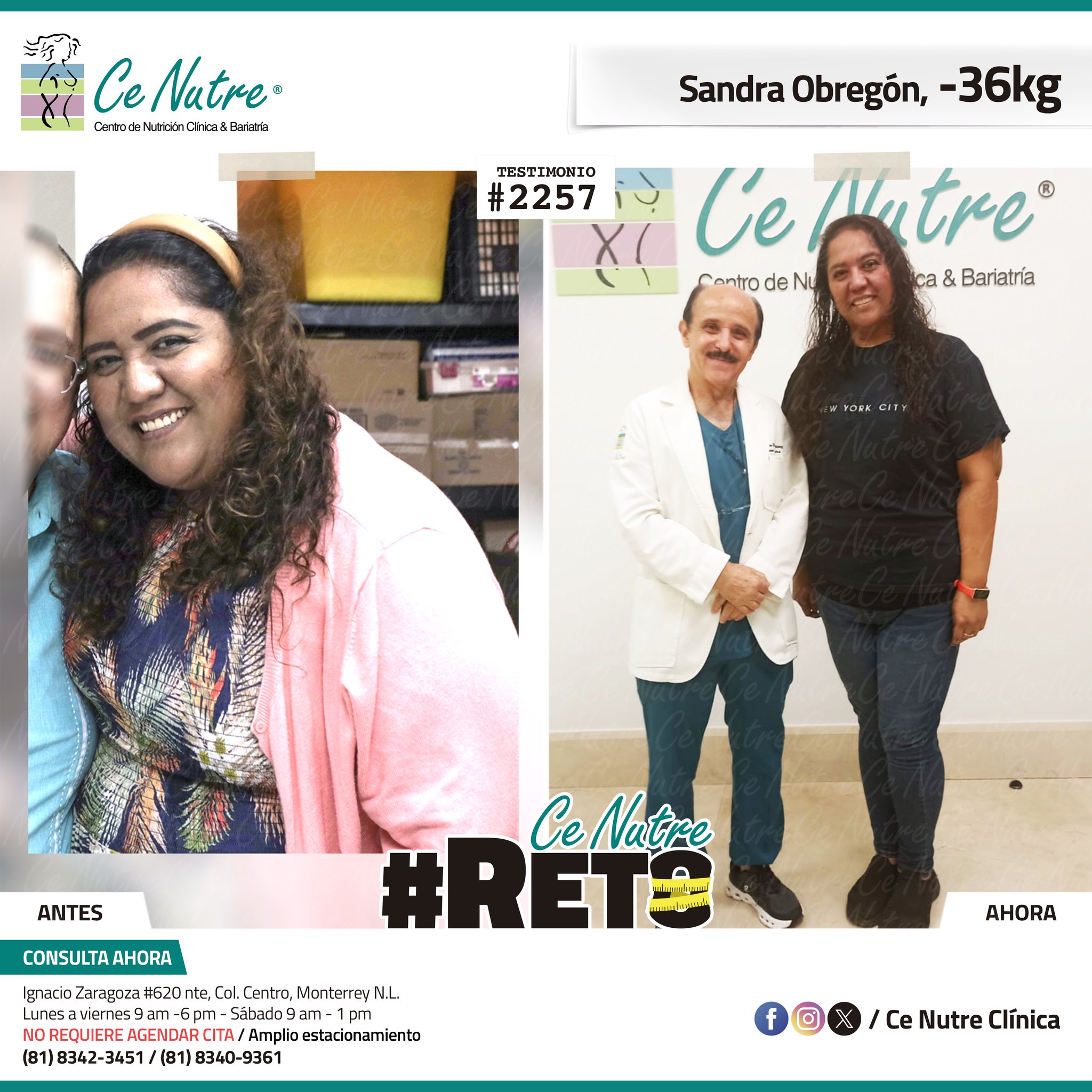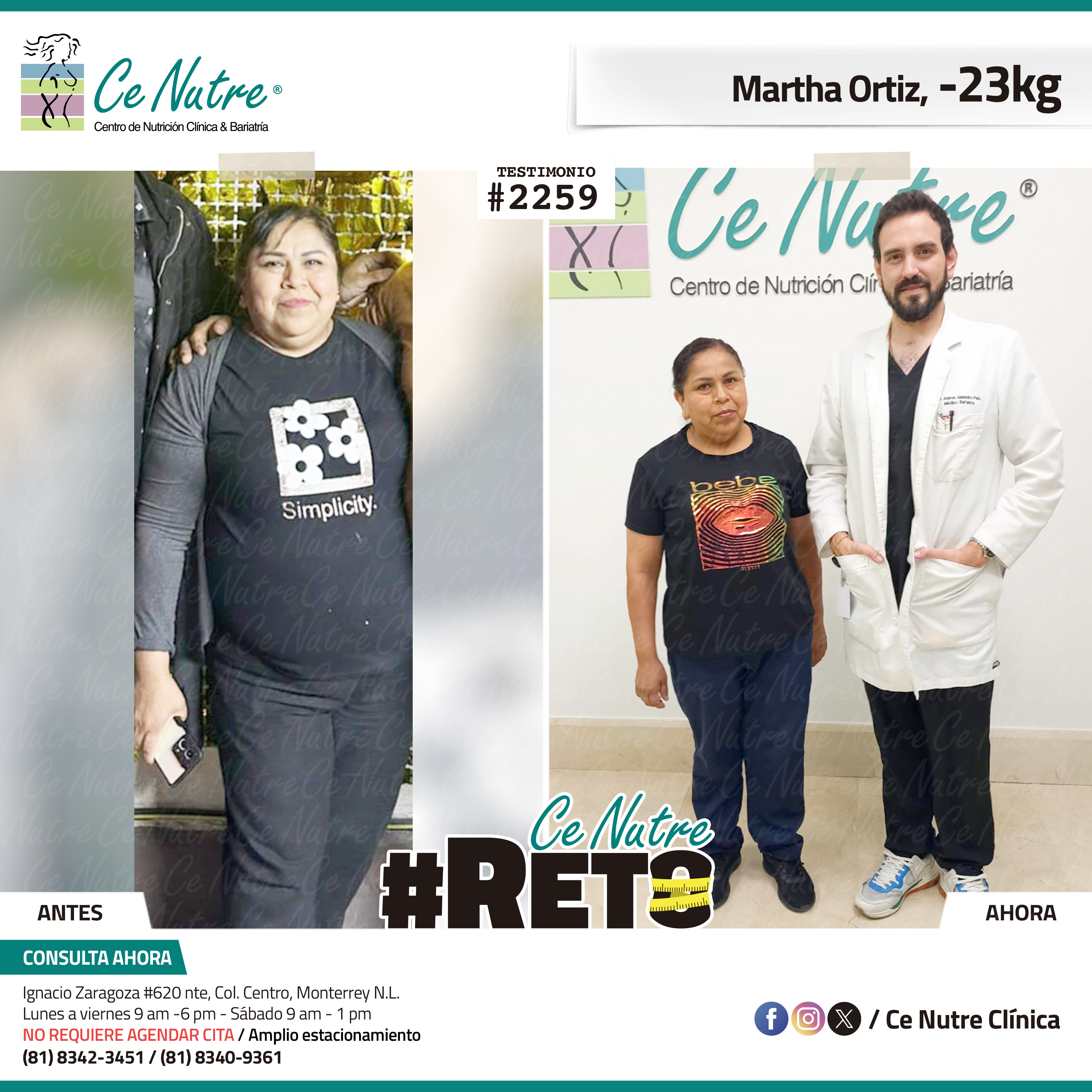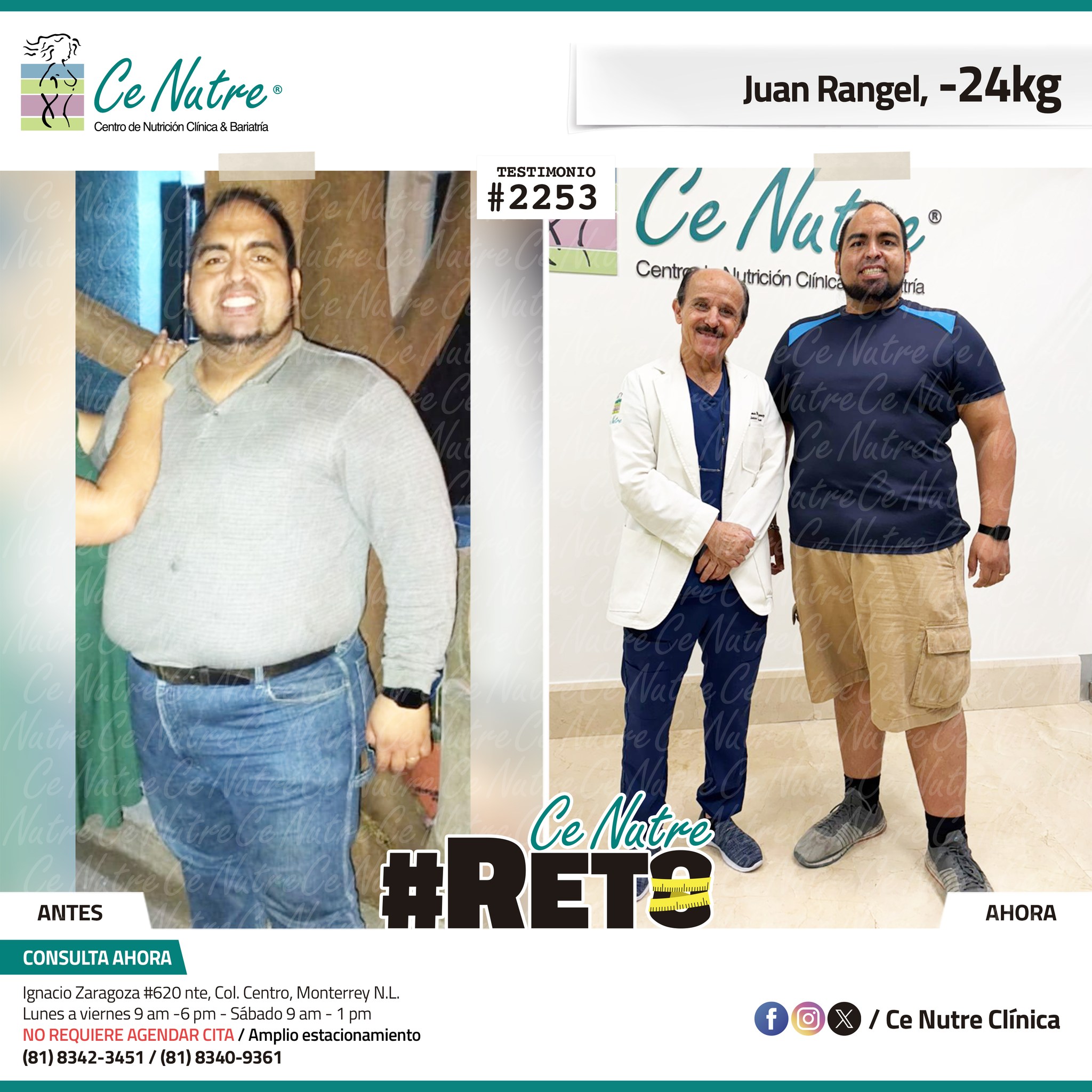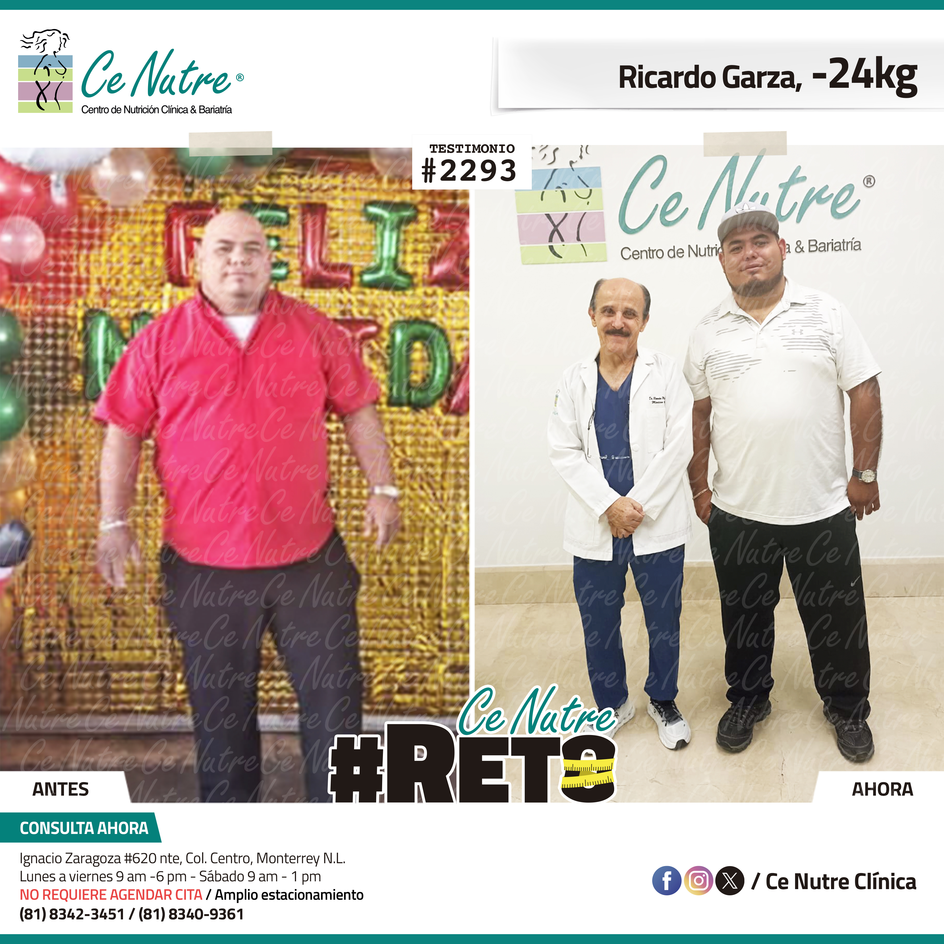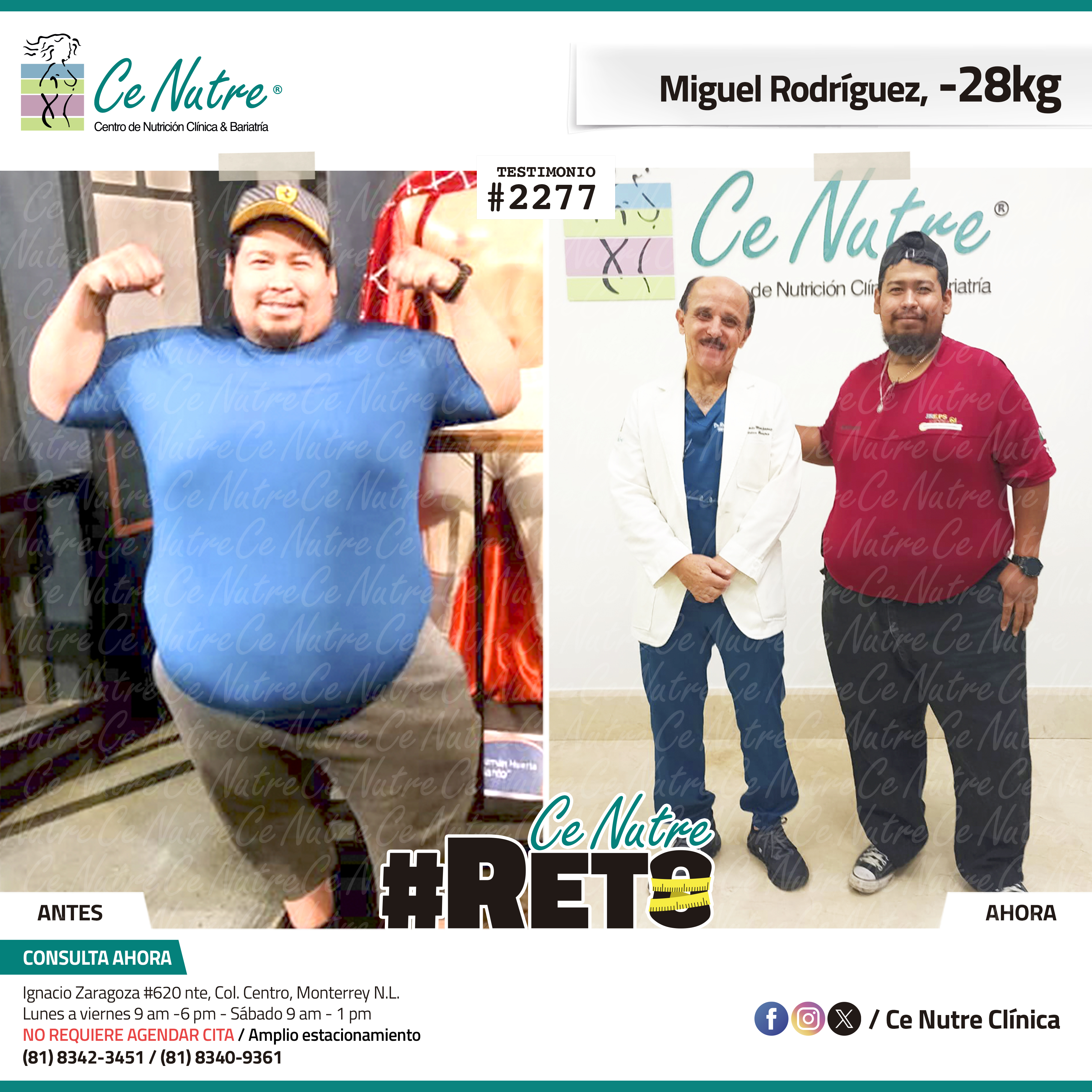 “Hola mi nombre es Adrian Torres y llegué a Ce Nutre por recomendación de mi pareja, tomé la decisión de venir ya que al realizar ciertas actividades en mi trabajo empecé a tener dificultades, estoy feliz de poder compartirles que me siento muy bien con la pérdida de peso que he logrado, no solo se trata de los números en la báscula, sino de la energía y la confianza que he recuperado. Cada día me siento más fuerte, más saludable y más cómodo conmigo mismo. Esto ha sido un desafío pero con mucha disciplina y siguiendo las indicaciones de los nutriólogos he obtenido muy buenos resultados, se los recomiendo.”