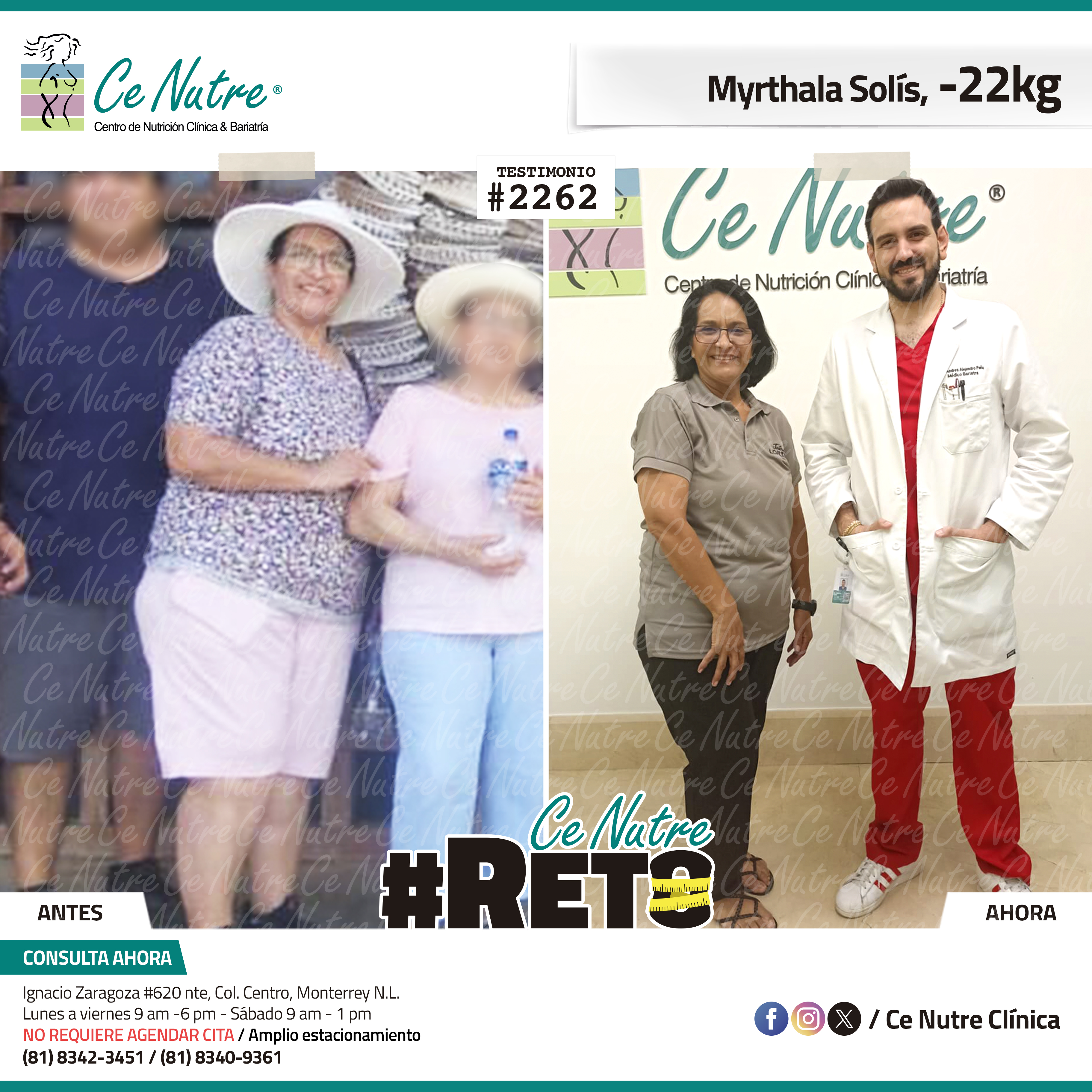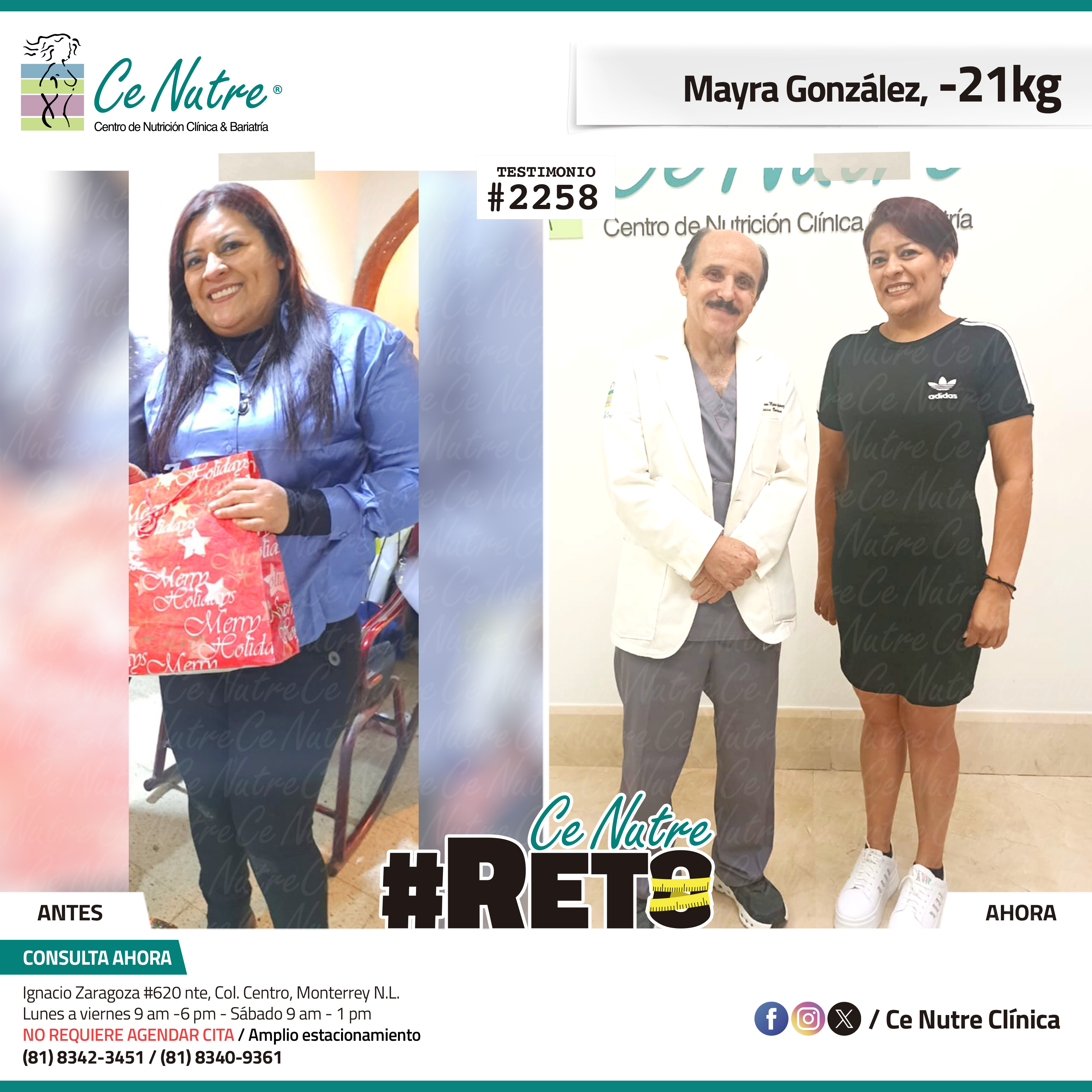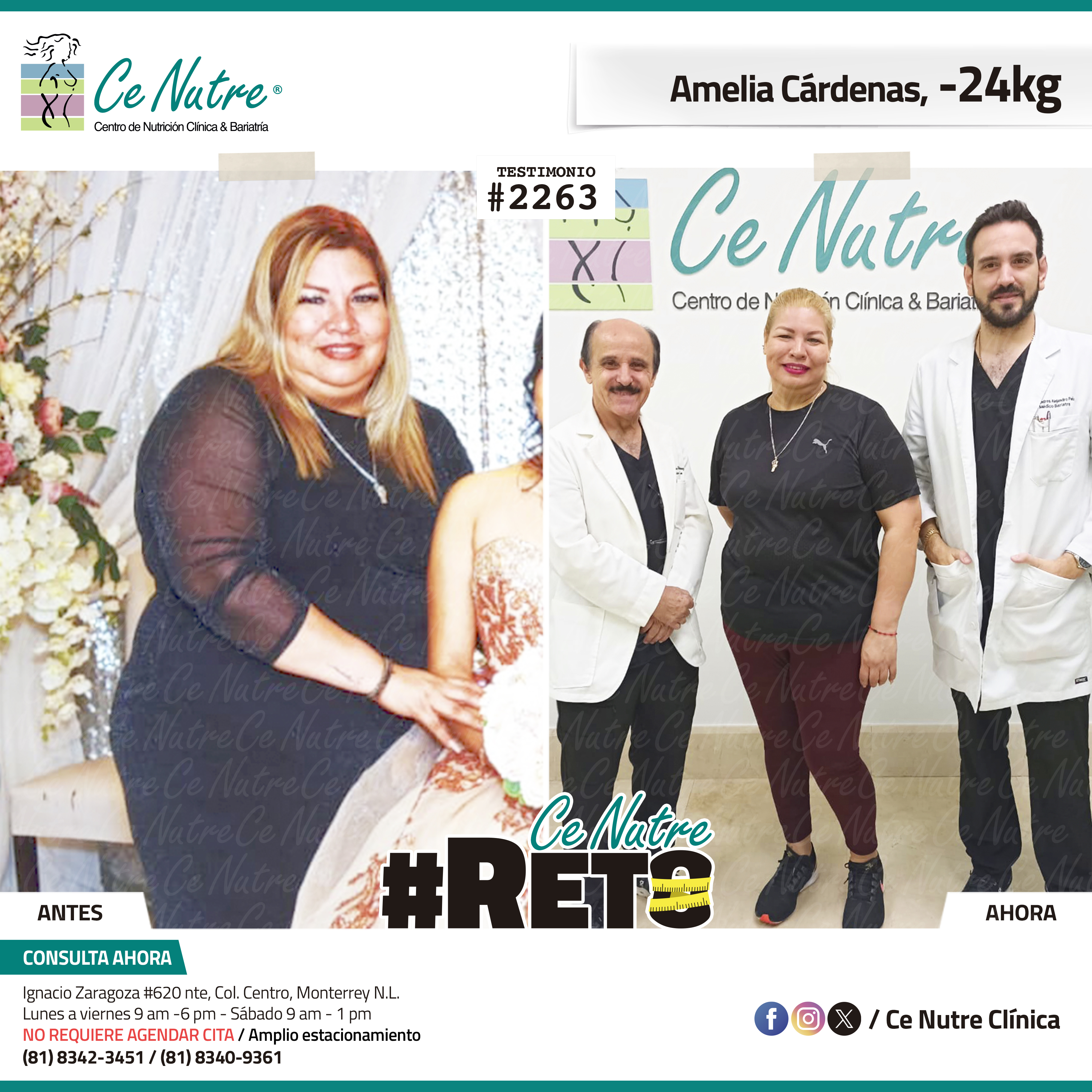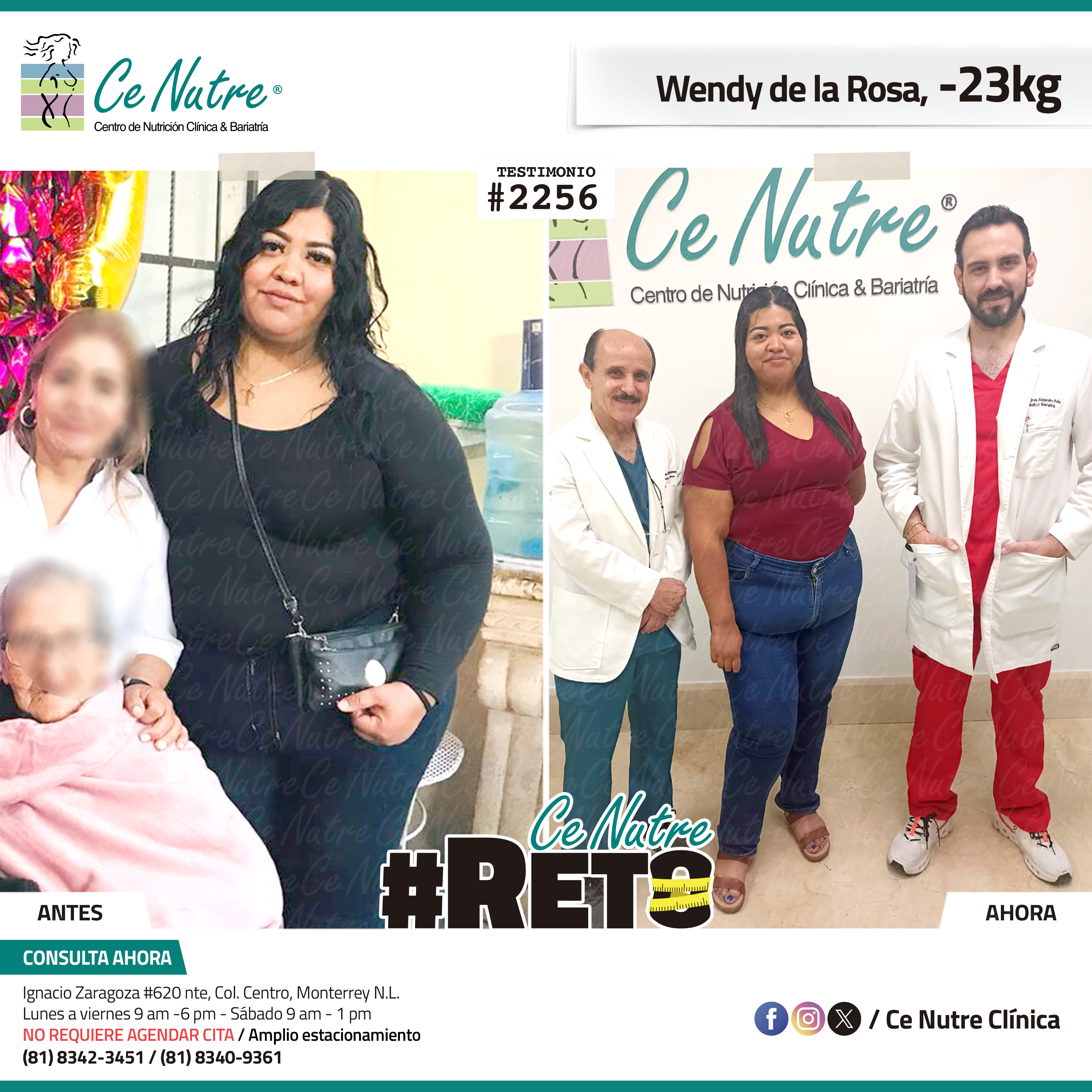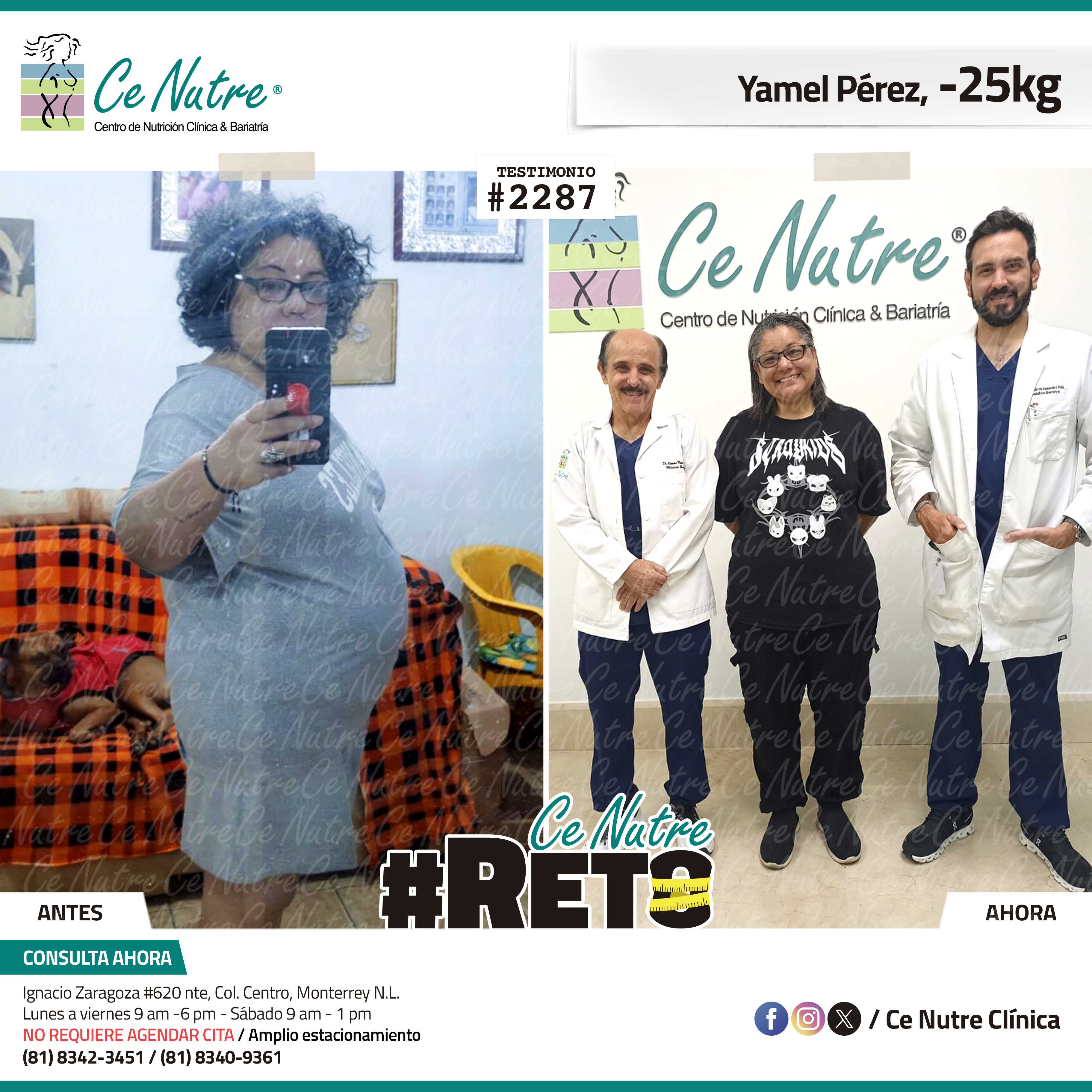 “Hola mi nombre es Adrian Torres y llegué a Ce Nutre por recomendación de mi pareja, tomé la decisión de venir ya que al realizar ciertas actividades en mi trabajo empecé a tener dificultades, estoy feliz de poder compartirles que me siento muy bien con la pérdida de peso que he logrado, no solo se trata de los números en la báscula, sino de la energía y la confianza que he recuperado. Cada día me siento más fuerte, más saludable y más cómodo conmigo mismo. Esto ha sido un desafío pero con mucha disciplina y siguiendo las indicaciones de los nutriólogos he obtenido muy buenos resultados, se los recomiendo.”