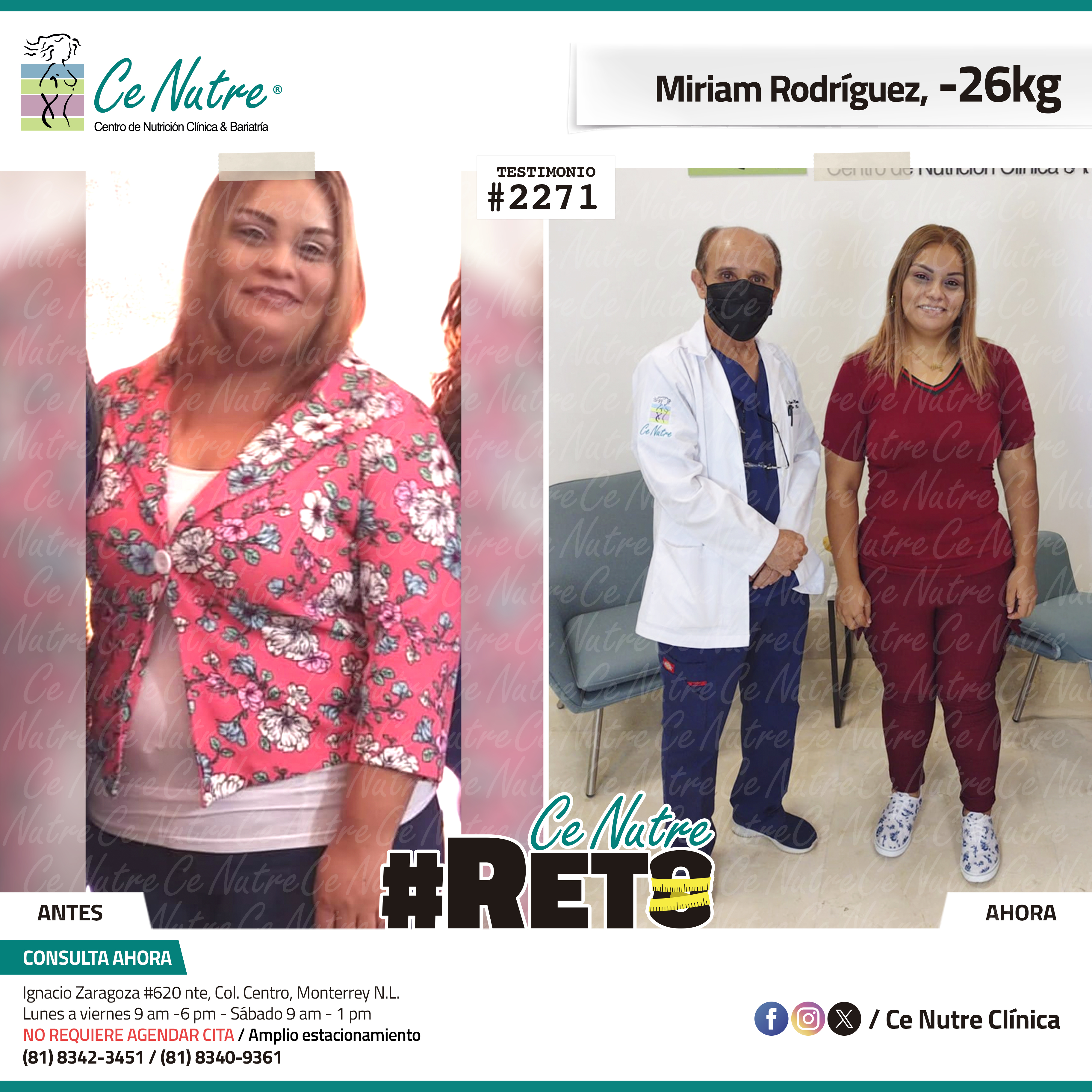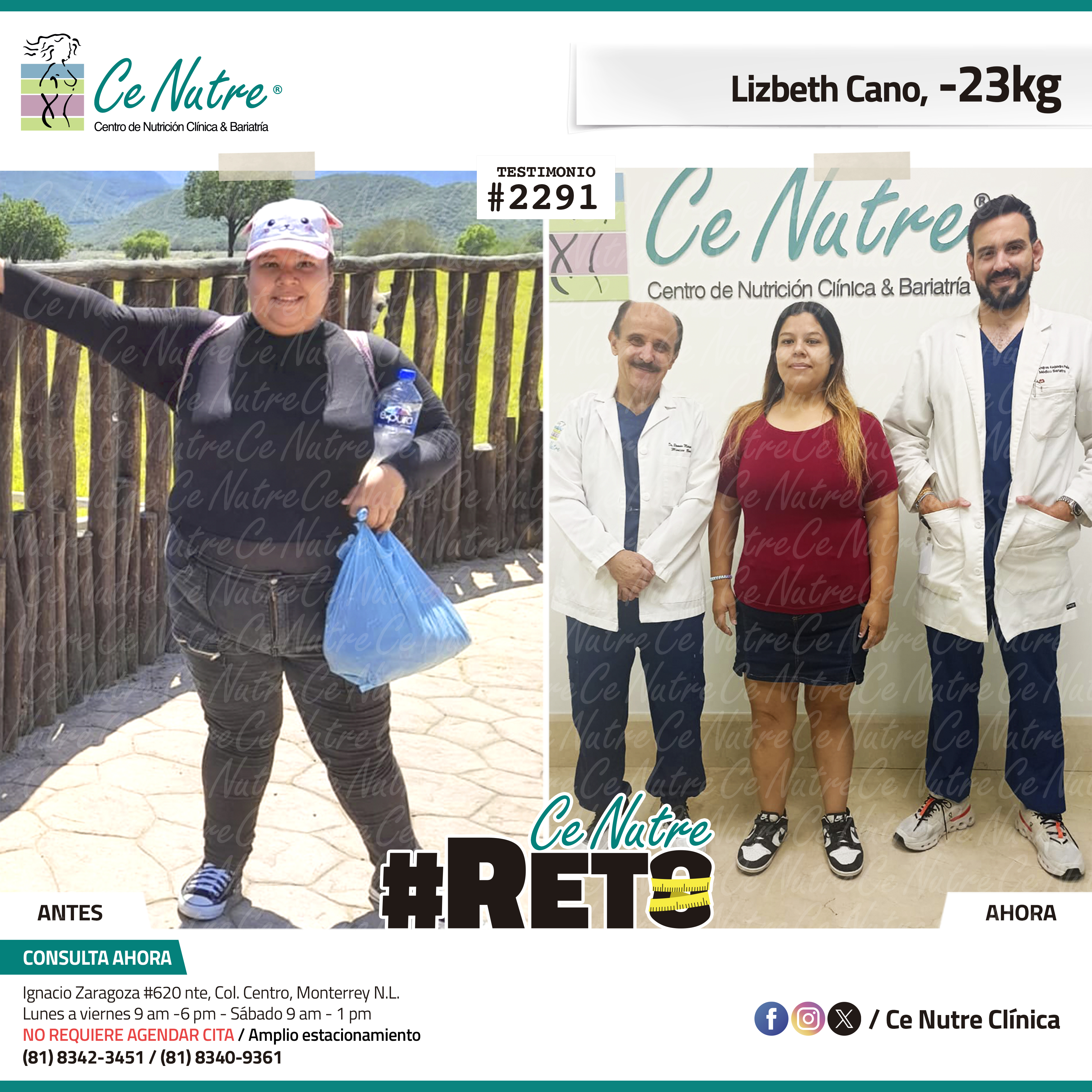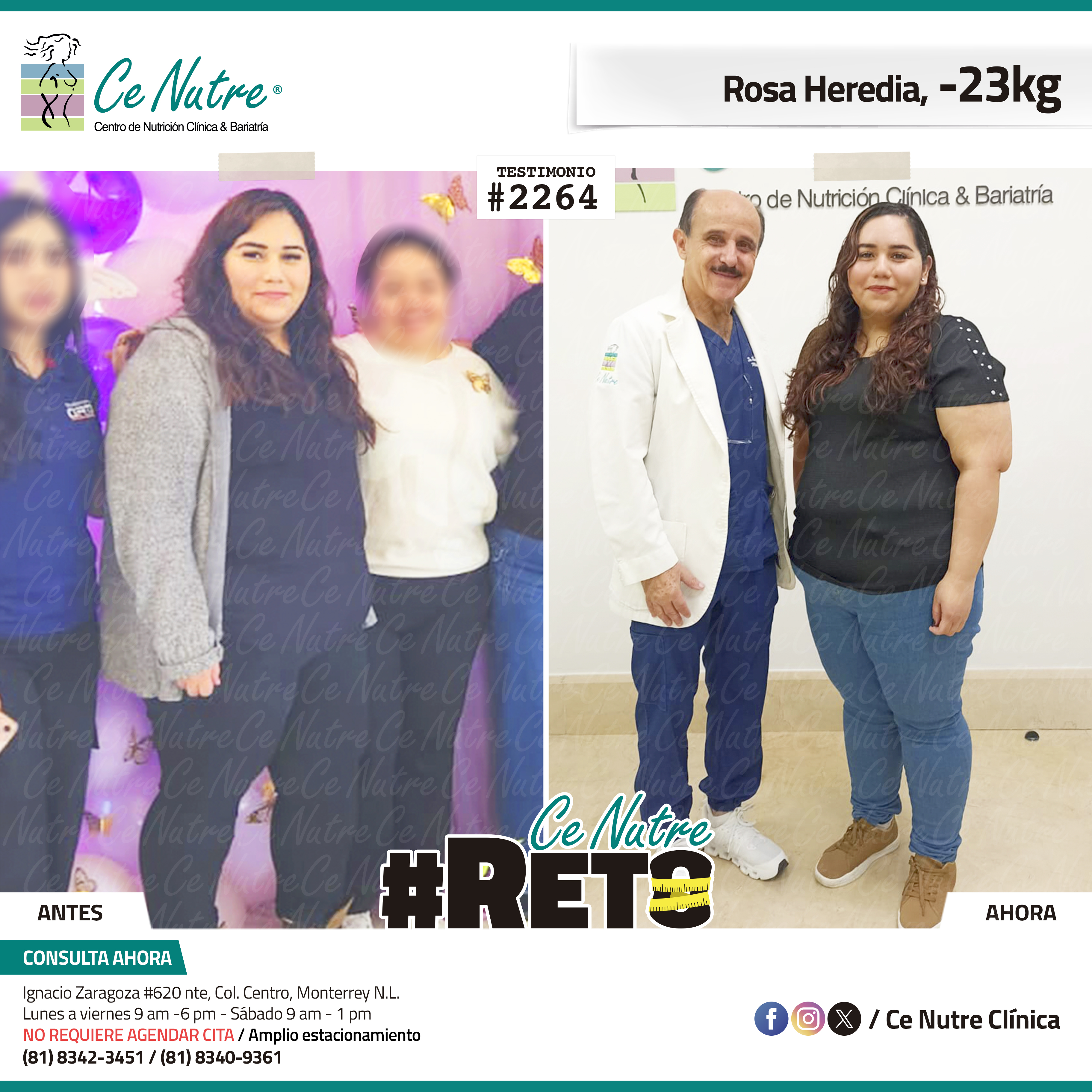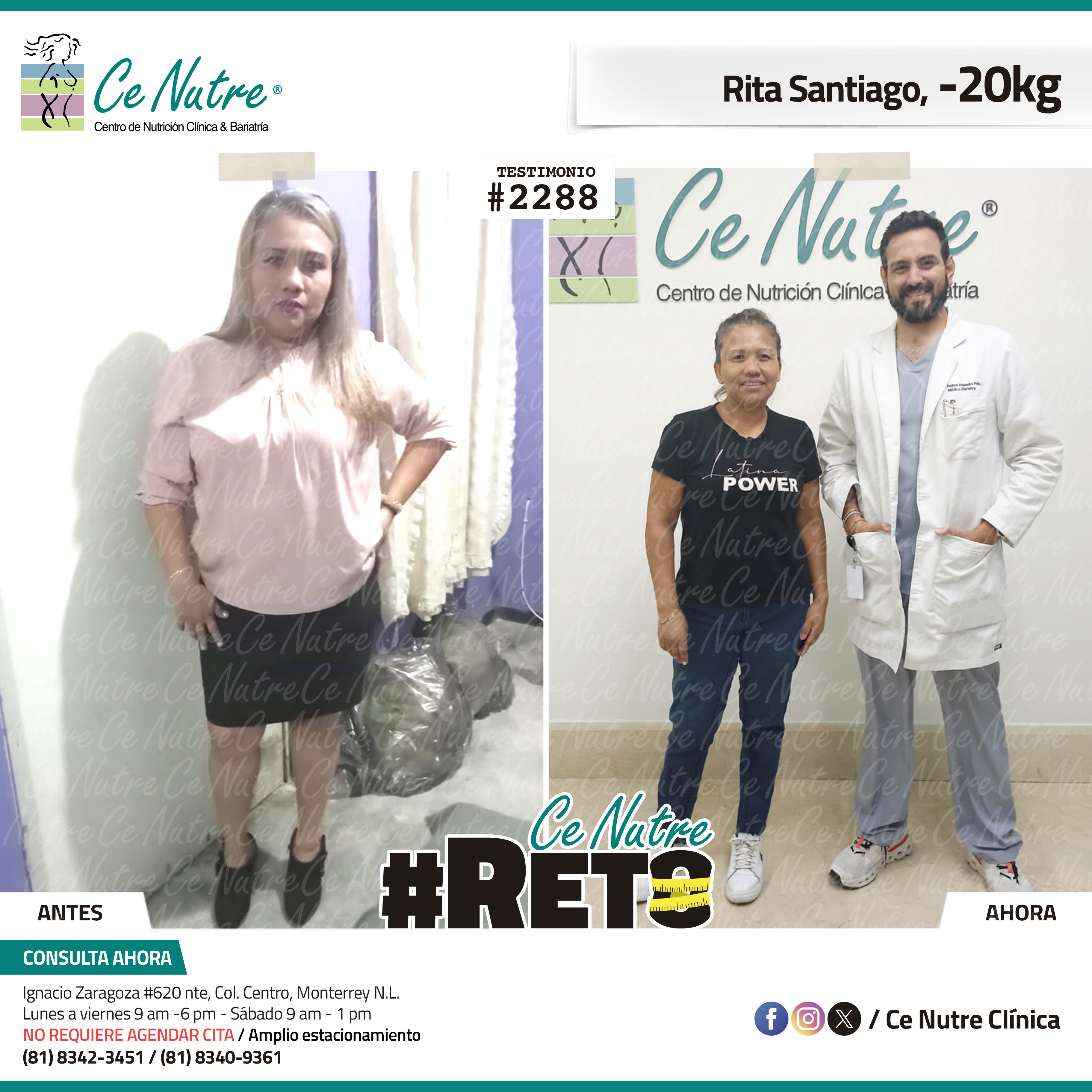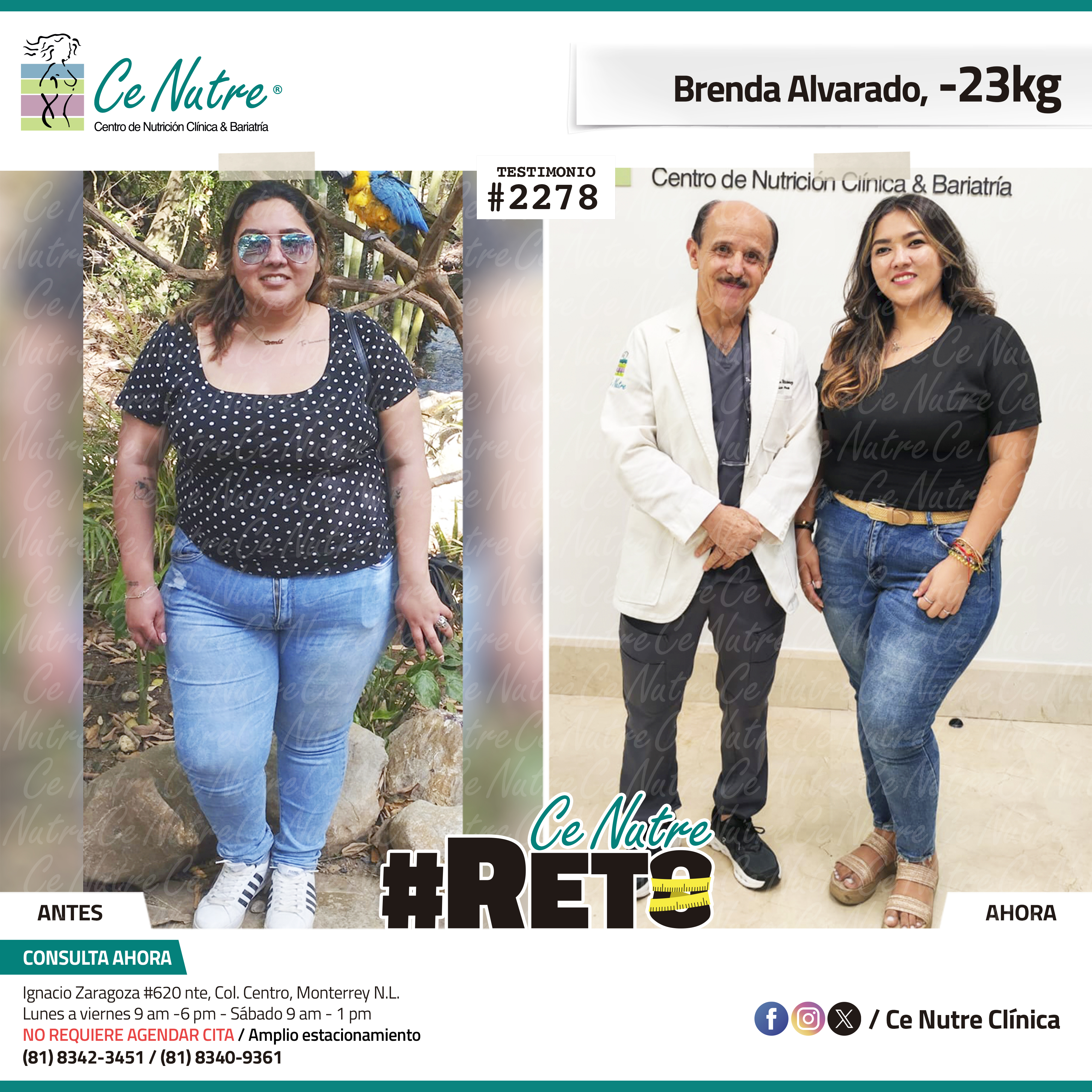 “Hola mi nombre es Adrian Torres y llegué a Ce Nutre por recomendación de mi pareja, tomé la decisión de venir ya que al realizar ciertas actividades en mi trabajo empecé a tener dificultades, estoy feliz de poder compartirles que me siento muy bien con la pérdida de peso que he logrado, no solo se trata de los números en la báscula, sino de la energía y la confianza que he recuperado. Cada día me siento más fuerte, más saludable y más cómodo conmigo mismo. Esto ha sido un desafío pero con mucha disciplina y siguiendo las indicaciones de los nutriólogos he obtenido muy buenos resultados, se los recomiendo.”