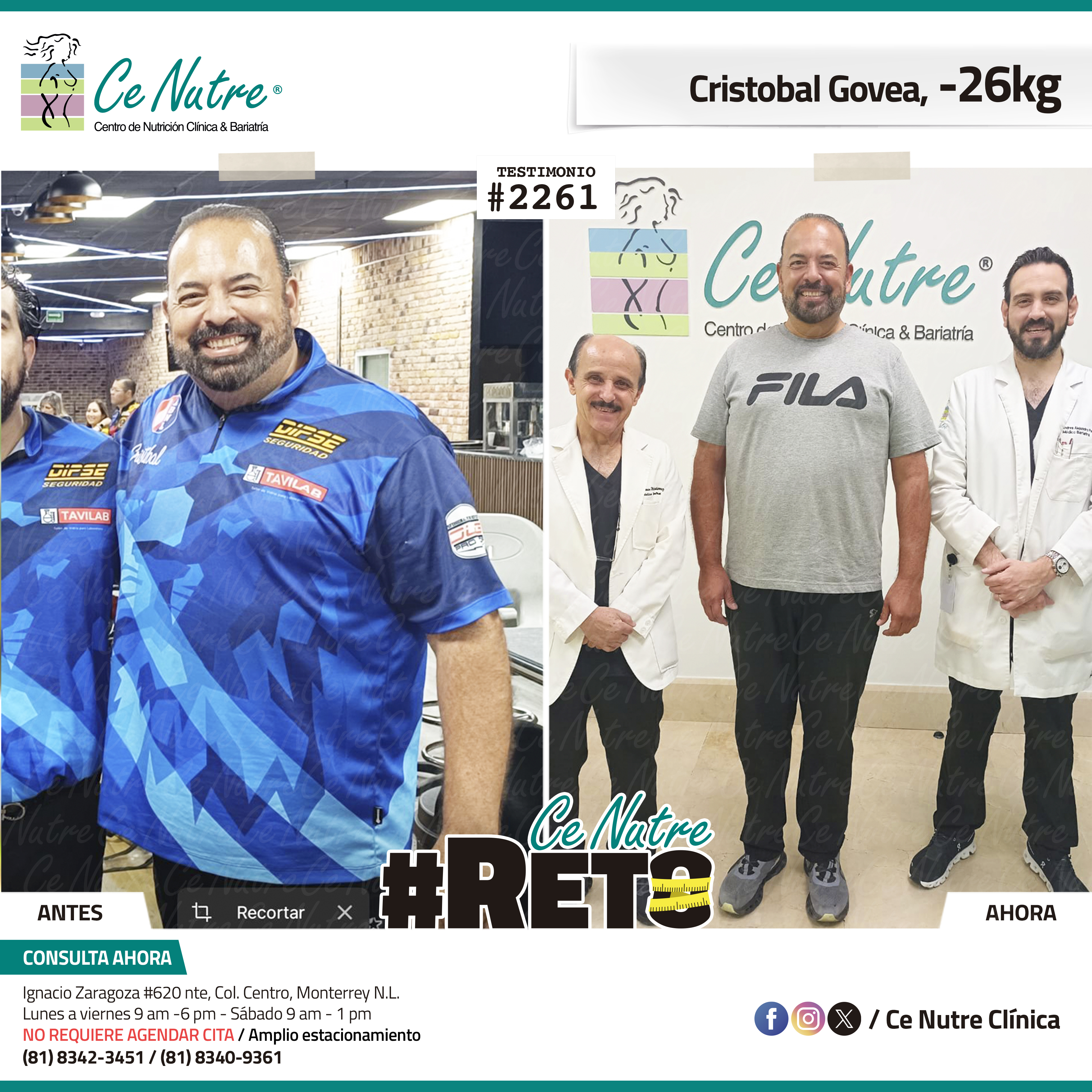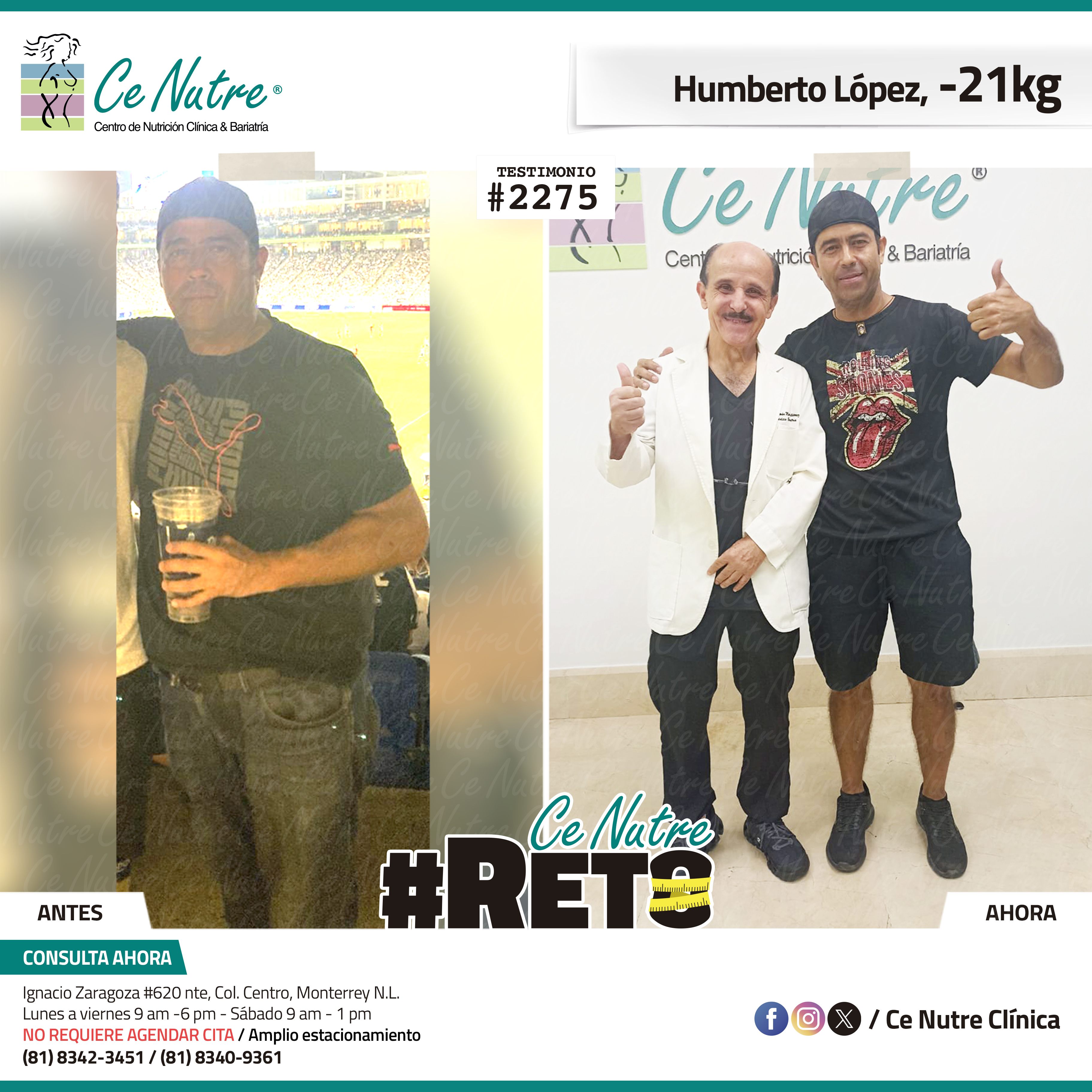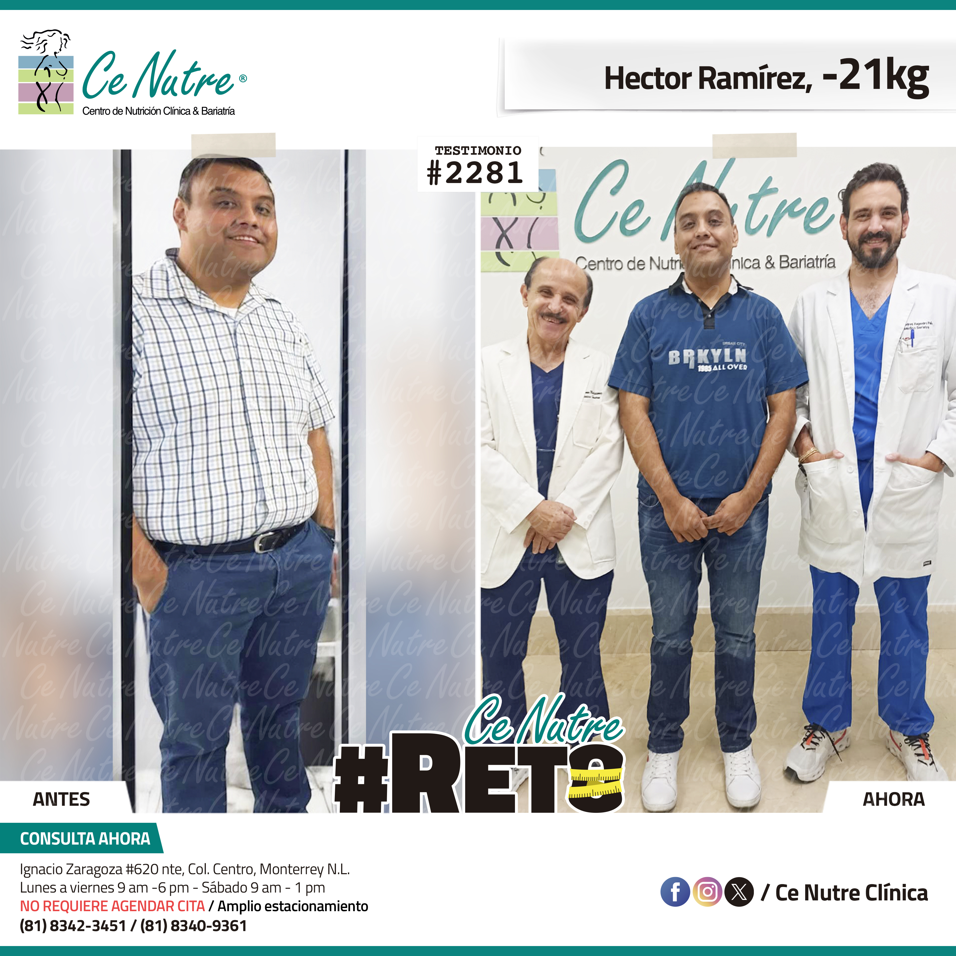 “Hola mi nombre es Hector y yo conocí la clínica Ce Nutre gracias a mi compañera de trabajo y a mi prima, las cuales me motivaron a dar este paso, principalmente porque mi sobrepeso ya me estaba rebasando y afectando en mi salud. Le agradezco mucho a los doctores y al personal de la clínica por toda la atención que recibí en el transcurso de mis consultas. A toda aquella persona que esté en esta misma situación les recomiendo que se atrevan a venir y a mejorar su salud, no es muy complicado llevar a cabo la dieta, es muy fácil y no te limitas demasiado en cuanto a la alimentación, solo es cuestión de fuerza de voluntad y dejar los excesos. Muchas gracias a mi familia que siempre me apoyó en mi proceso. ”