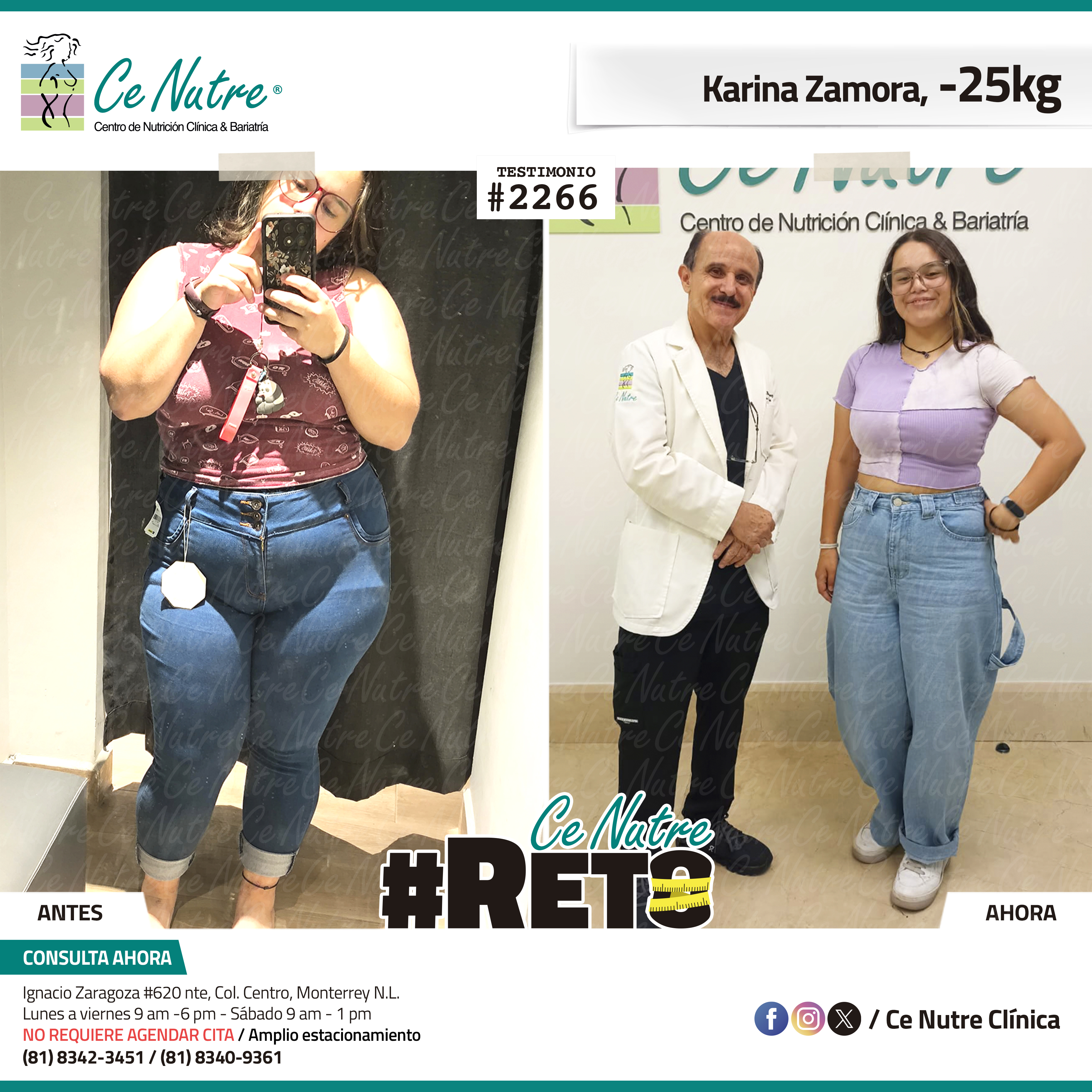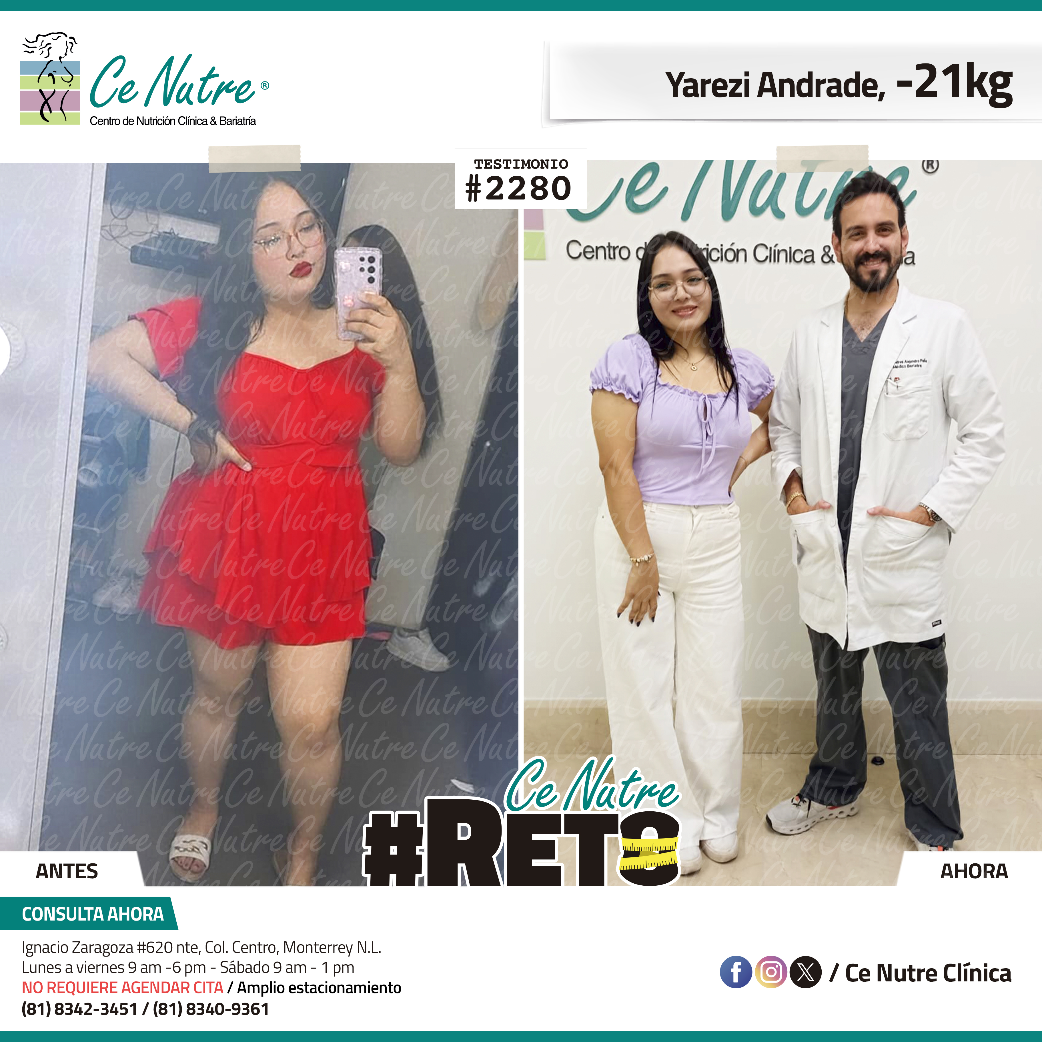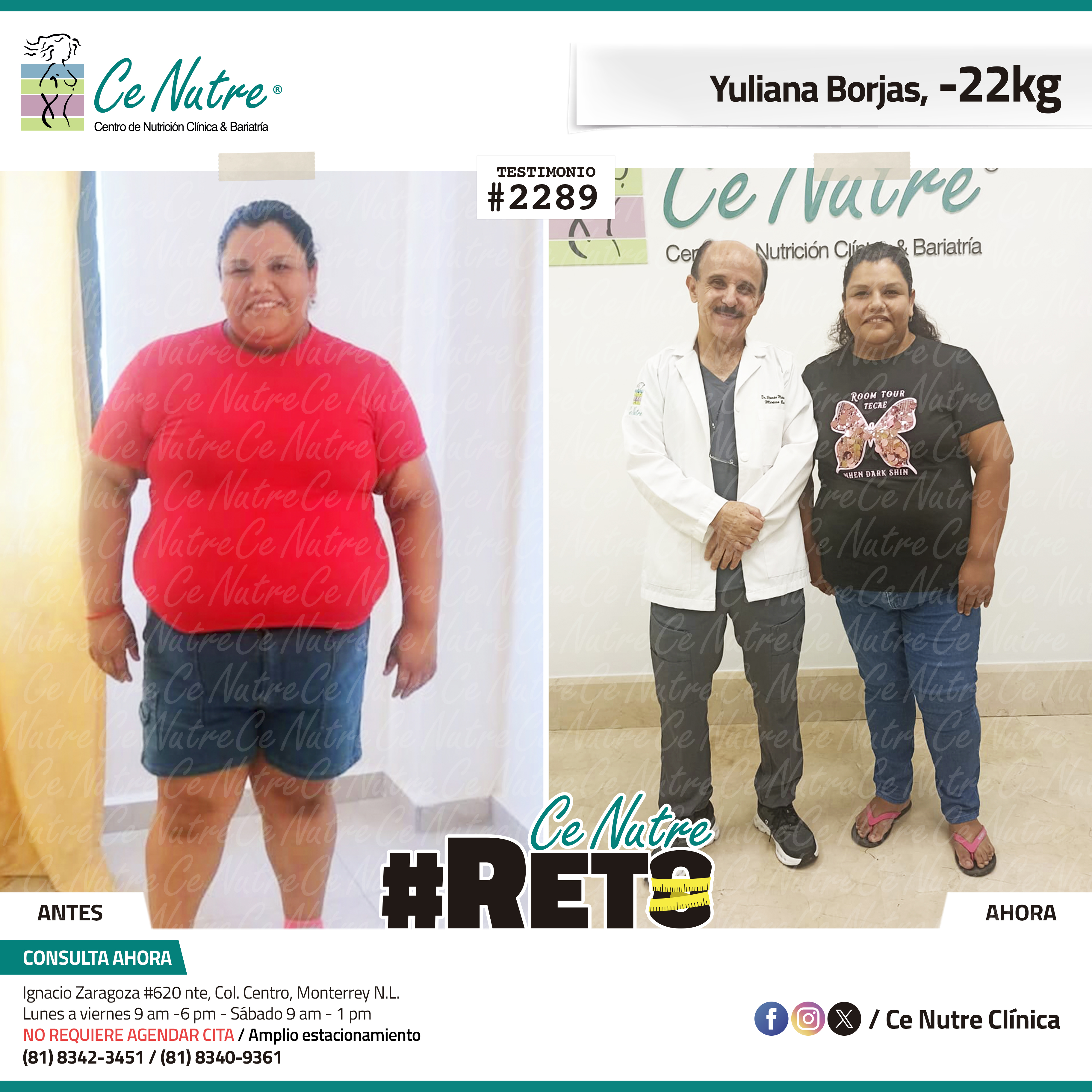 “Hola mi nombre es Yuliana Borjas y me enteré de la clínica por una prima y me motivé a venir ya que siempre he querido un bebé y siempre me decían que es por mi peso, quiero llegar a mi meta deseada para poder lograr mi sueño de ser mamá, al principio es difícil la dieta ya que te quitas los malos hábitos como las tortillas, refrescos, golosinas pero lo que me motiva es que esto no es un sacrificio sino es cambiar tu estilo de vida para sentirte mejor física y mentalmente. Quiero agradecer a mi familia por siempre darme fuerzas para seguir adelante y no tirar la toalla, y muchas gracias a Ce Nutre por enseñarnos a que con disciplina y desempeño podemos cambiar nuestro estilo de vida.”