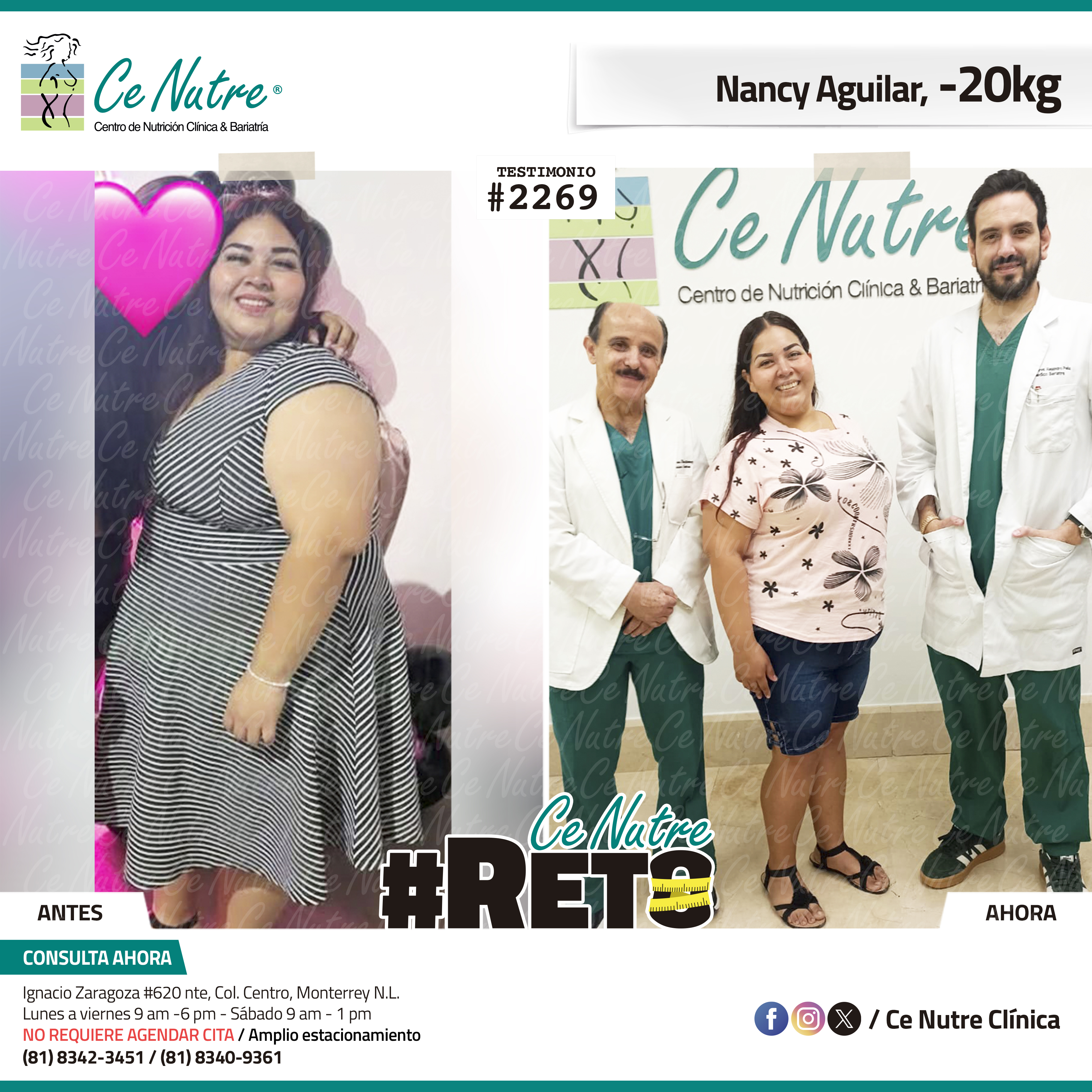 “Hola mi nombre es Nancy vine a Ce Nutre por recomendación de una tía, vine porque ya no me gustaba lo que veía en el espejo, me sentía muy cansada y sin ánimos. A partir de que vine me sentí muy motivada, dejé la coca, como más sano, tomo más agua, me siento más ligera y me empieza a gustar cómo me veo. Agradezco todo el apoyo a mi familia por motivarme y ayudarme con esta nueva etapa que estoy viviendo.”