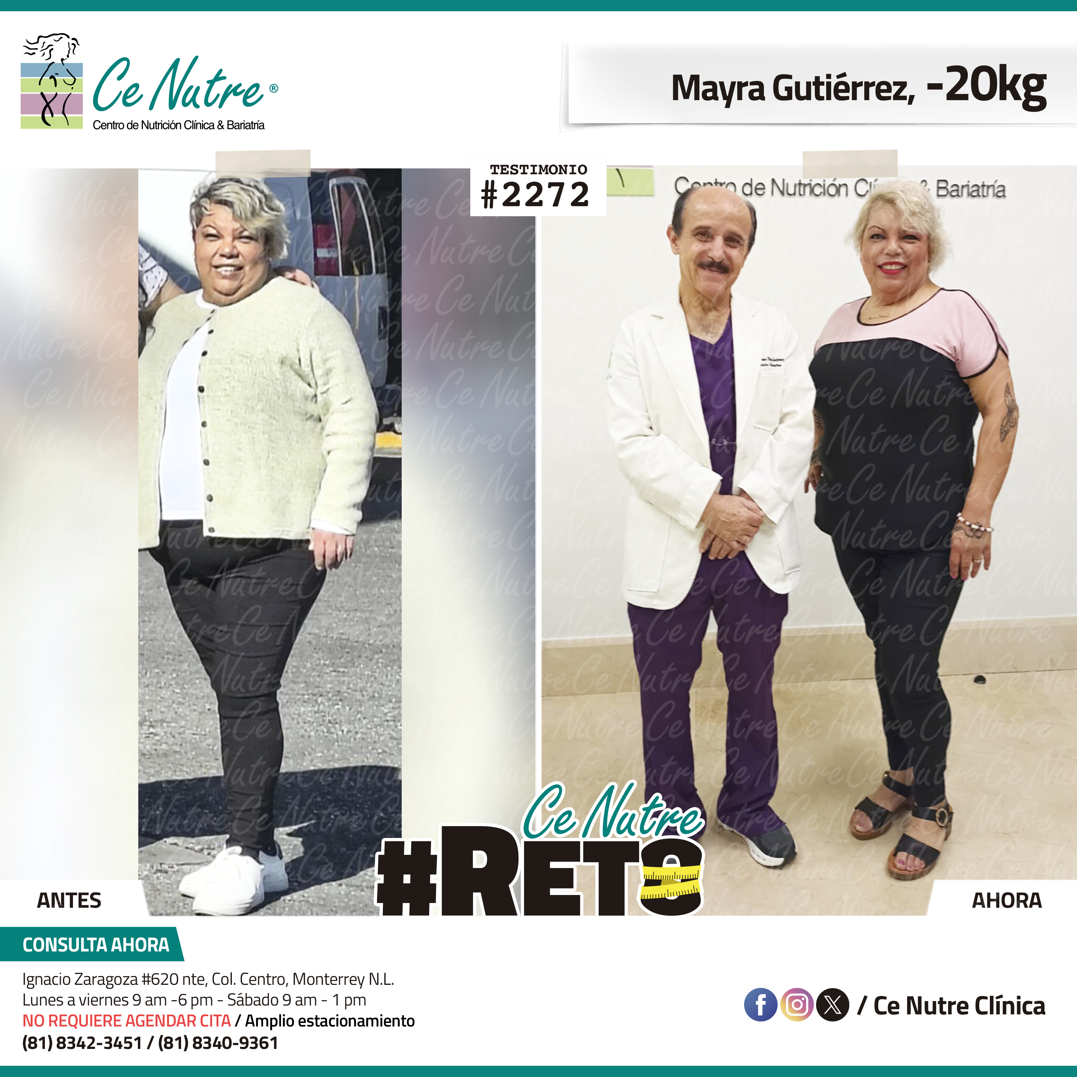 “Llegué a Ce Nutre porque ya hace tiempo había venido y me funcionó muy bien, pero en esta etapa al tener hipertiroidismo batallaba mucho para bajar de peso. Siguiendo el plan de alimentación, tomando las malteadas, haciendo ejercicio, tomando el agua y venir constantemente a las citas indicadas de toma de peso me ha ayudado a que pueda ir logrando este reto. Gracias a mi familia, amigas y amigos que siempre me están motivando en mi proceso y echándome porras, así sigo en el camino hasta poder llegar a mi meta.”