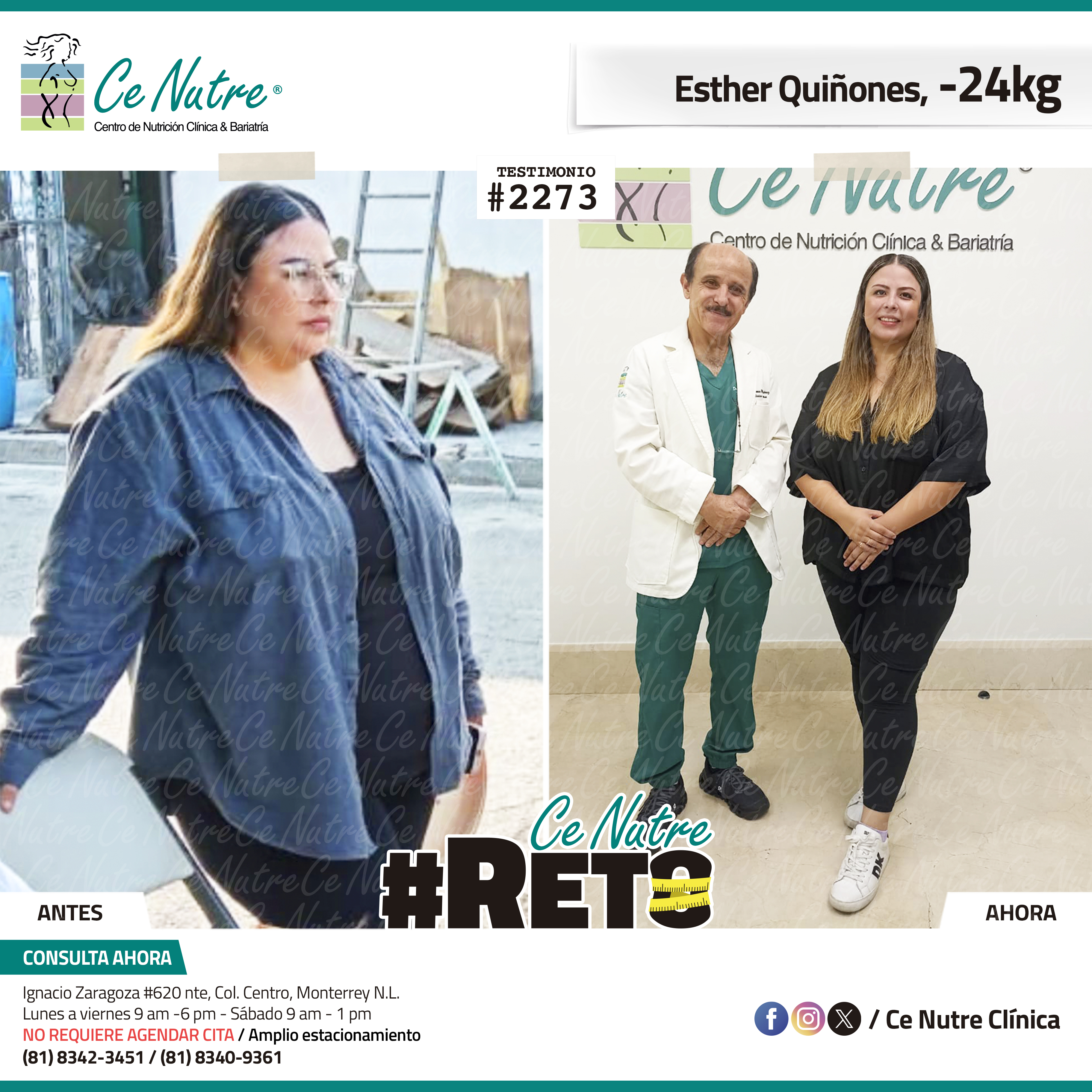 “Hola me llamo Esther, yo llegué a Ce Nutre por recomendación de compañeros de trabajo ya que no me sentía agusto con mi cuerpo porque la ropa ya no me quedaba bien y no me gustaba como se me veía, y sobre todo por temas de salud y tratar de evitar complicaciones en algún futuro por mi peso. Al iniciar la dieta me comencé a sentir con mucha más energía todo el tiempo, empecé a dormir más y aprendí que es mucho mejor tomar agua que cualquier otra cosa, y hasta el día de hoy me sigo sintiendo mucho mejor conmigo misma. Agradezco a mi mamá que es la que me apoya todo el tiempo y sobre todo me motiva a seguir con esta vida saludable.