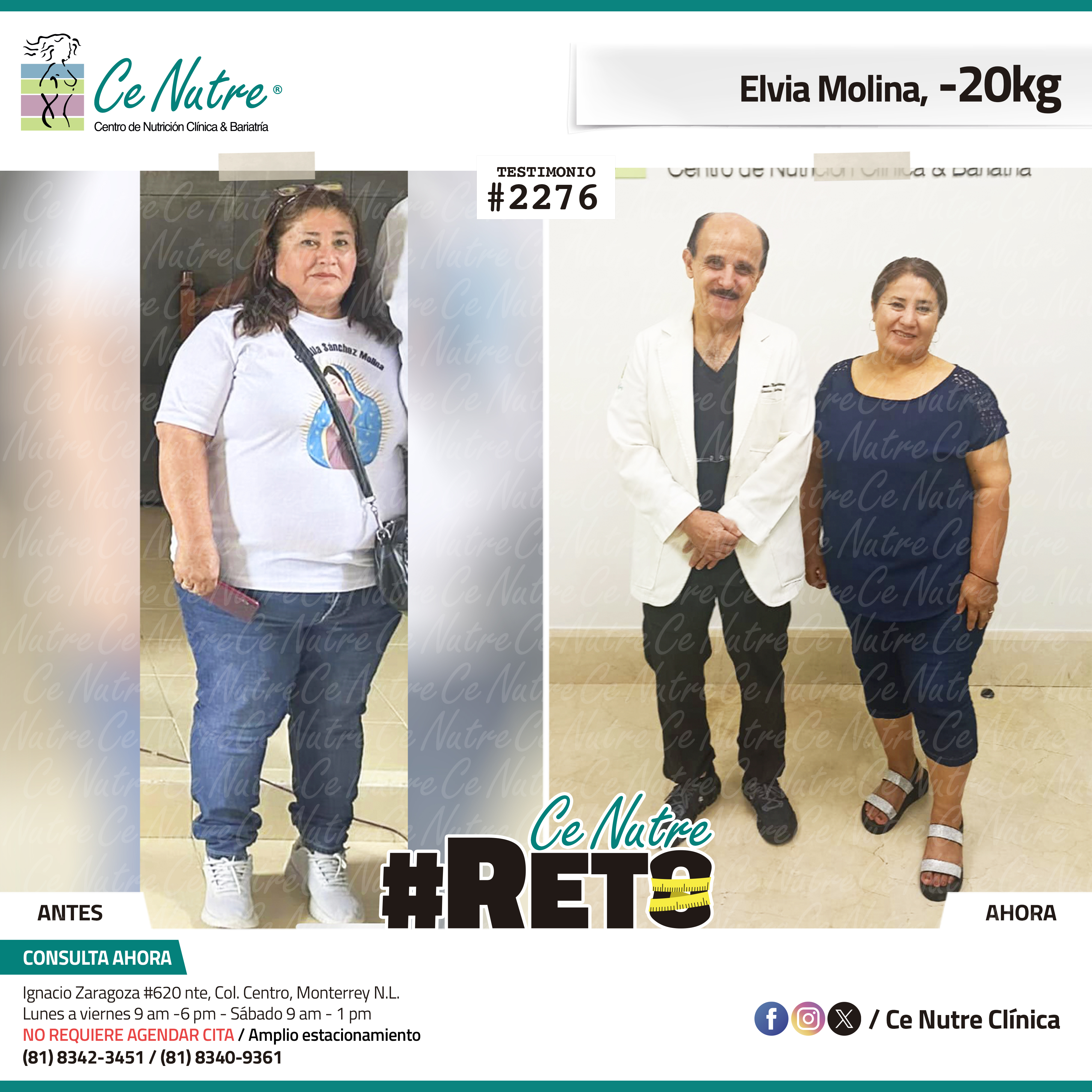 “Hola me llamo Elvia, llegué a Ce Nutre porque me sentía muy cansada y mi esposo me decía que buscara ayuda y mi hija me recomendó venir a Ce Nutre. Comencé mi tratamiento y dejé de consumir tortilla, pan, cosas dulces y refresco, hoy me siento feliz, delgada, recibo muchos comentarios positivos, ya me duelen menos las rodillas, me pongo la ropa que me gusta y me siento liviana, activa y ágil. Le agradezco infinitamente a toda m familia, especialmente a mi esposo que siempre está conmigo ayudándome.”