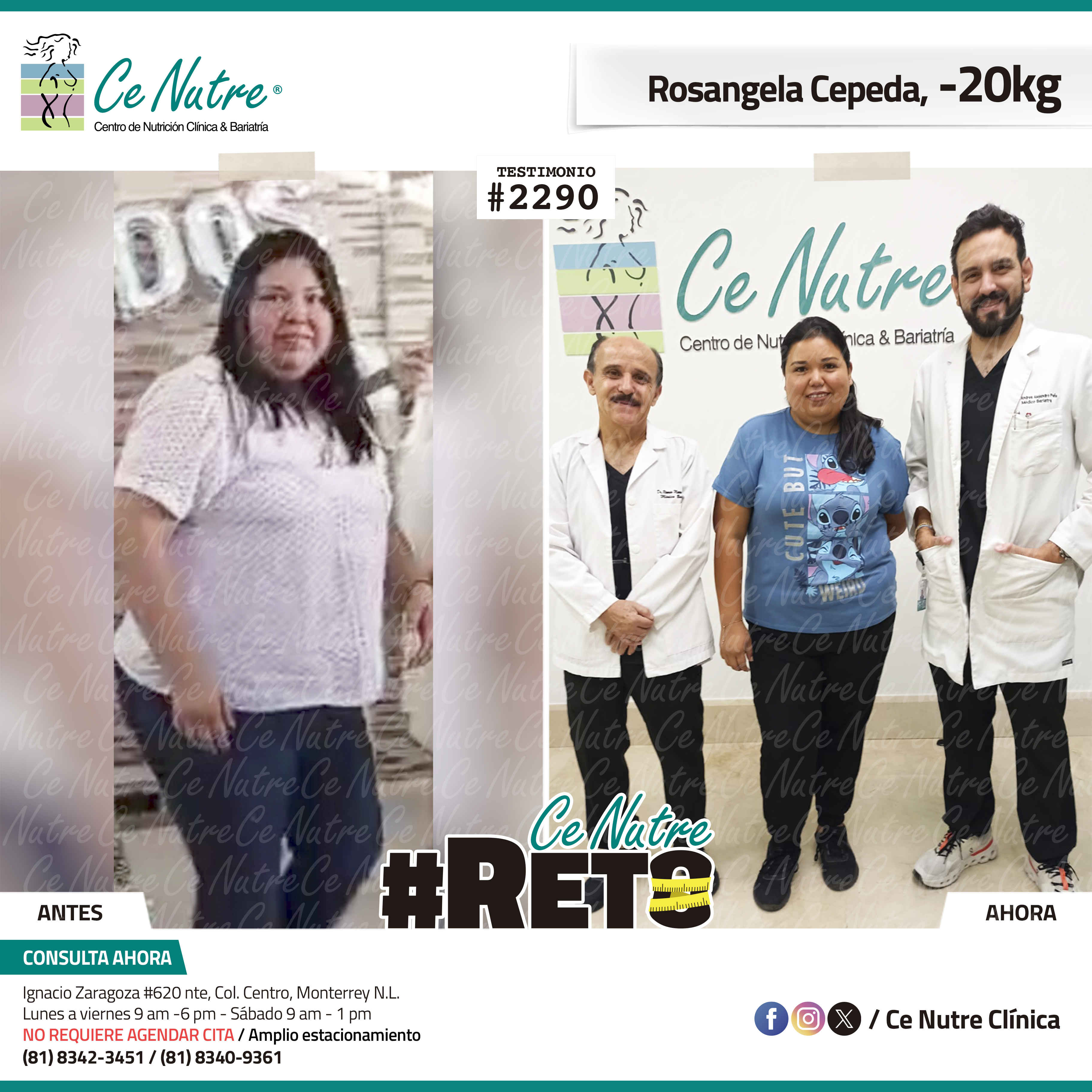 “Hola soy Rosangela y llegué a Ce Nutre por recomendación de una amiga, el motivo por el que decidí empezar a hacer algo por mi fue primeramente por salud ya que mis padres son diabéticos y ademas de que me dolían las piernas, se me hinchaban los pies, me cansaba mucho y ya no podía jugar con mi hija. Ahora ya me siento mucho mejor, sé que todavía me falta pero estoy segura de llegar a mi meta. Quiero agradecer a mi familia y amigos por su apoyo y amor, y a Ce Nutre por ser parte de este proceso. ”